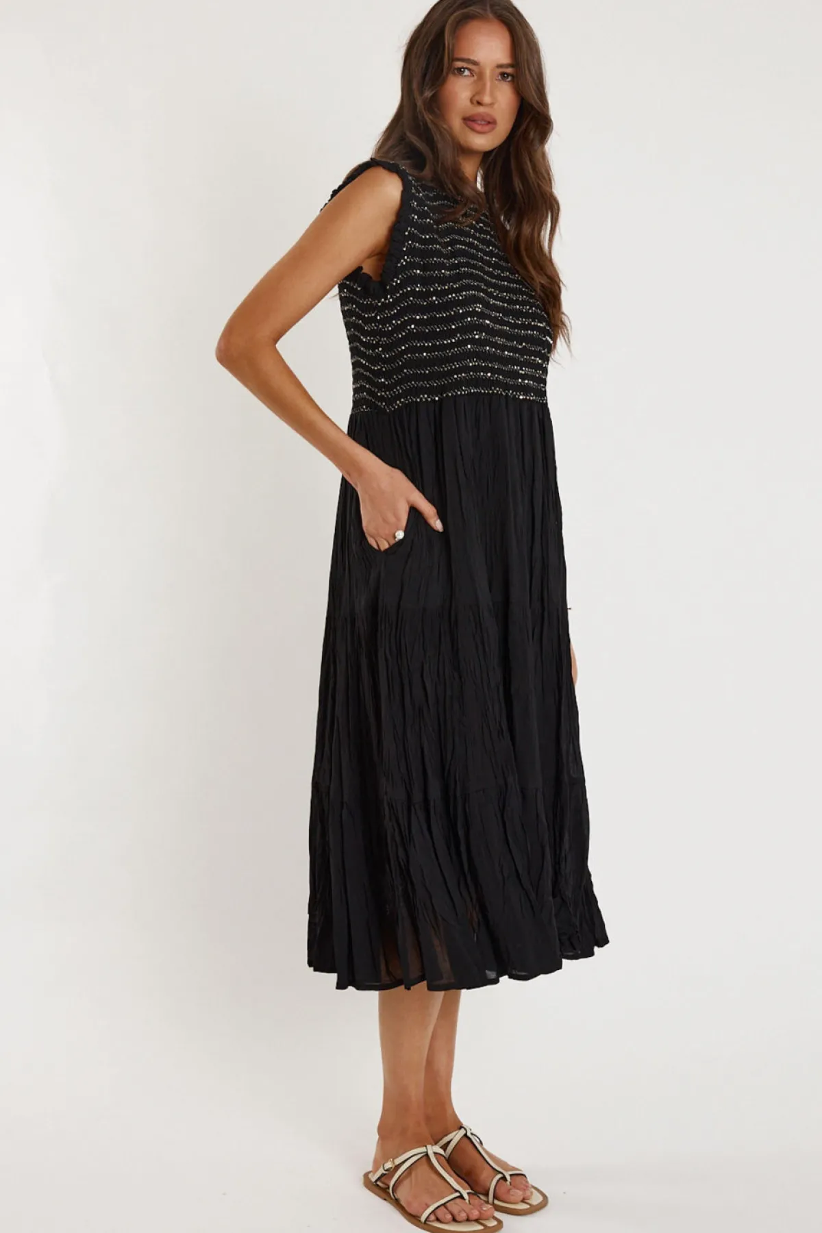 The Jolie Maxi is your go-to for effortless elegance. This stunning black maxi features a graceful tiered skirt that moves beautifully, keeping you cool and comfortable through warm summer evenings. Dress it up for resort dinners or down for casual days—versatility that works as hard as you do. Perfect for those moments when you want to look polished without trying too hard.