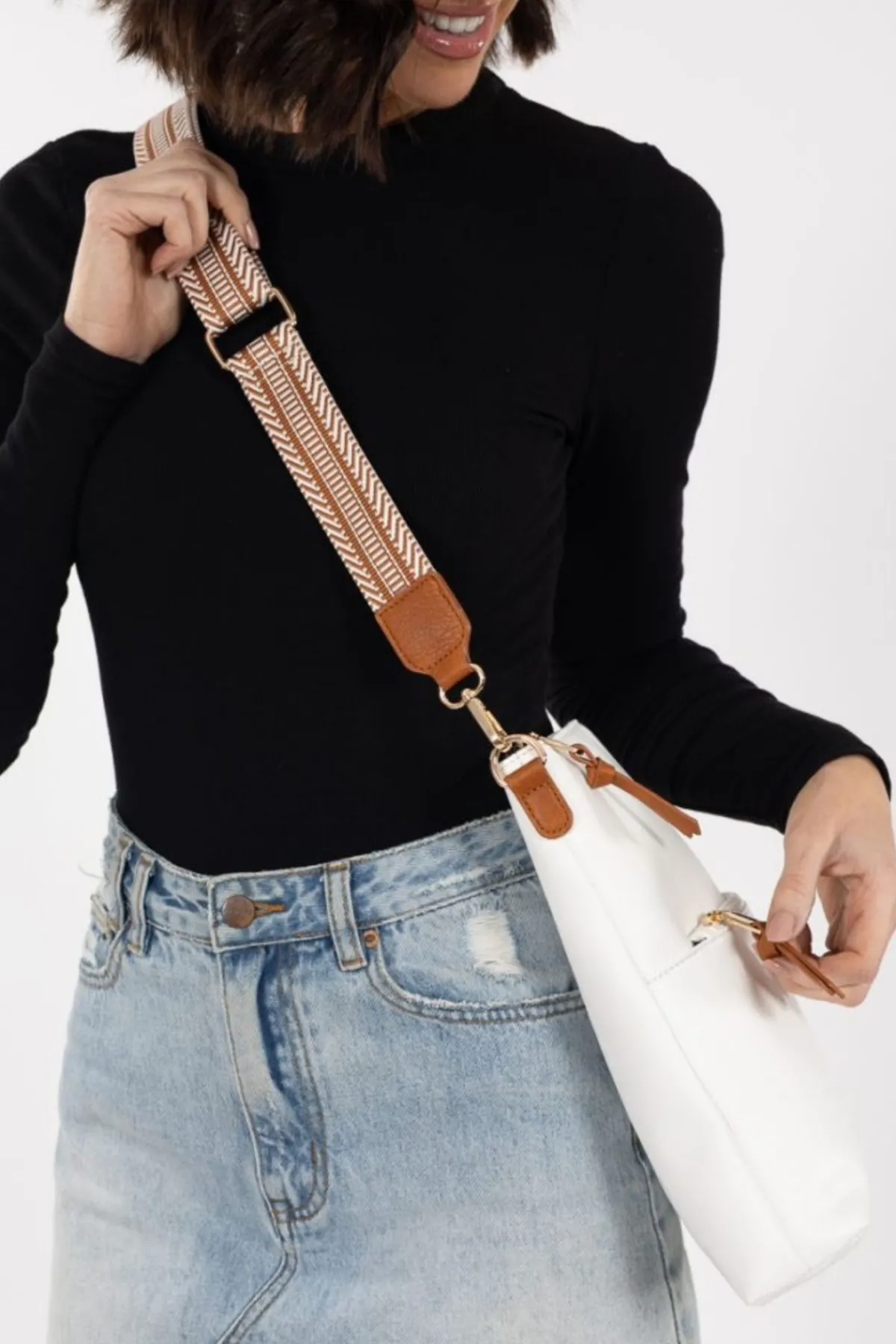 - External Features: The woven, patterned cotton cross body strap adds artistic flair to the bag.
