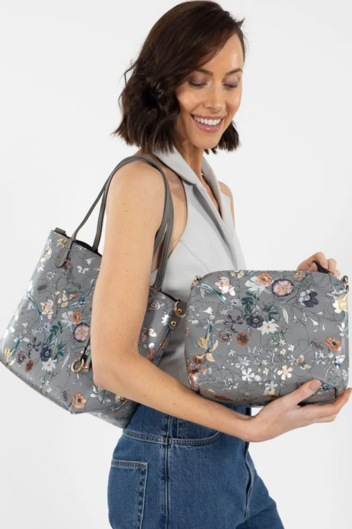 The Floral Gigi features a softly structured silhouette in floral fabric with subtle metallic highlights. Two handle options are included: a shoulder handle with a 21 cm drop, and a detachable crossbody strap (125 cm) that can be used with either the outer tote bag or the internal pouch.