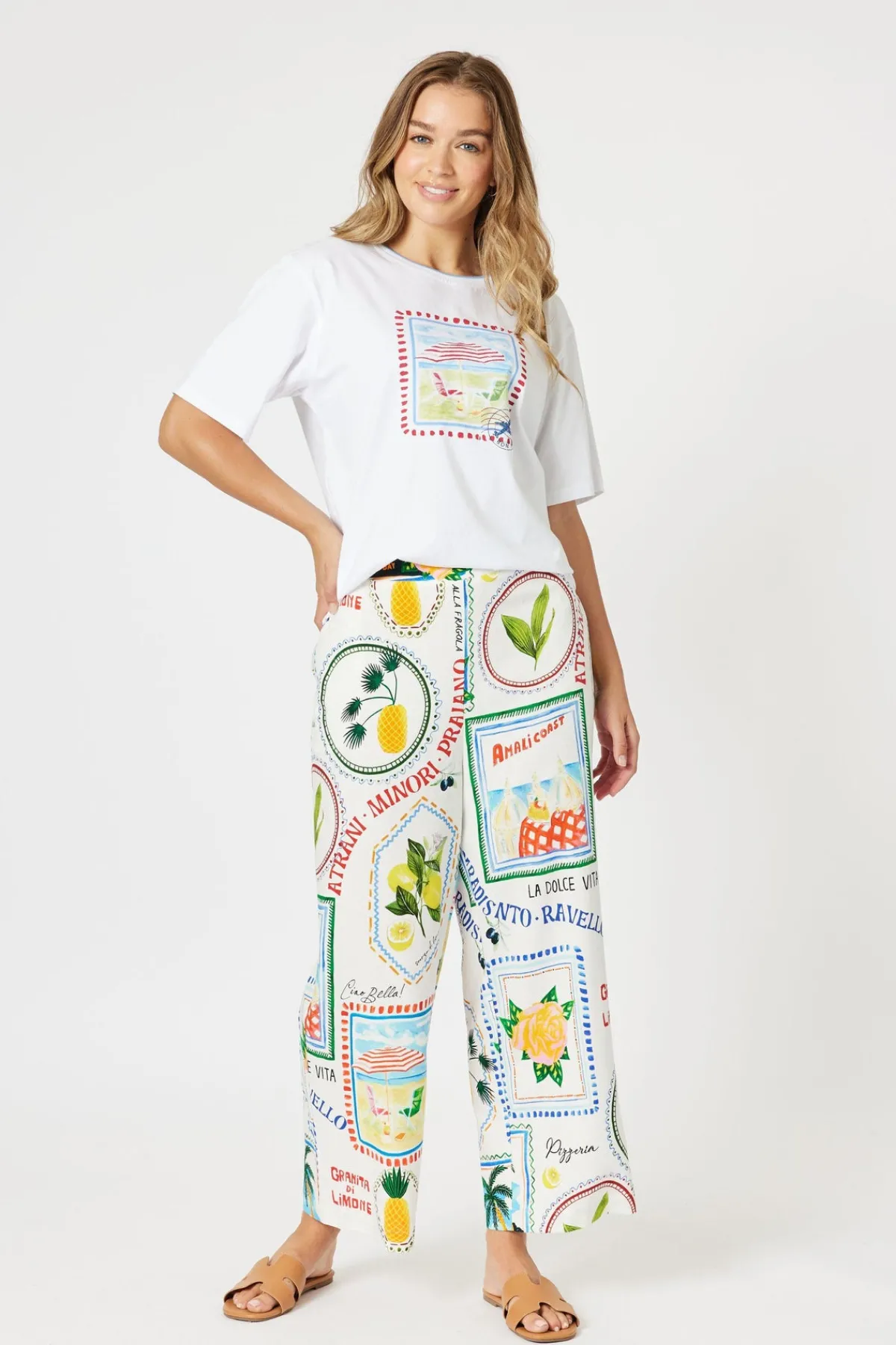 Bring a touch of coastal charm to your everyday wardrobe with The Amalfi Tee. Featuring a soft cotton feel and cuffed sleeves, this easy going white tee is elevated with a playful postcard-inspired print on the front – capturing the laid-back beauty of the Amalfi Coast with its beach umbrella and seaside motif. A subtle blue trim on the neckline adds a fresh pop of detail, making this tee even more unique. Designed for versatility, this tee is perfect for pairing with the Amalfi Pants for a coordinated look, or styling casually with denim, shorts, or skirts. Its lightweight, breathable fabric makes it a go-to piece for relaxed summer days and effortless layering.