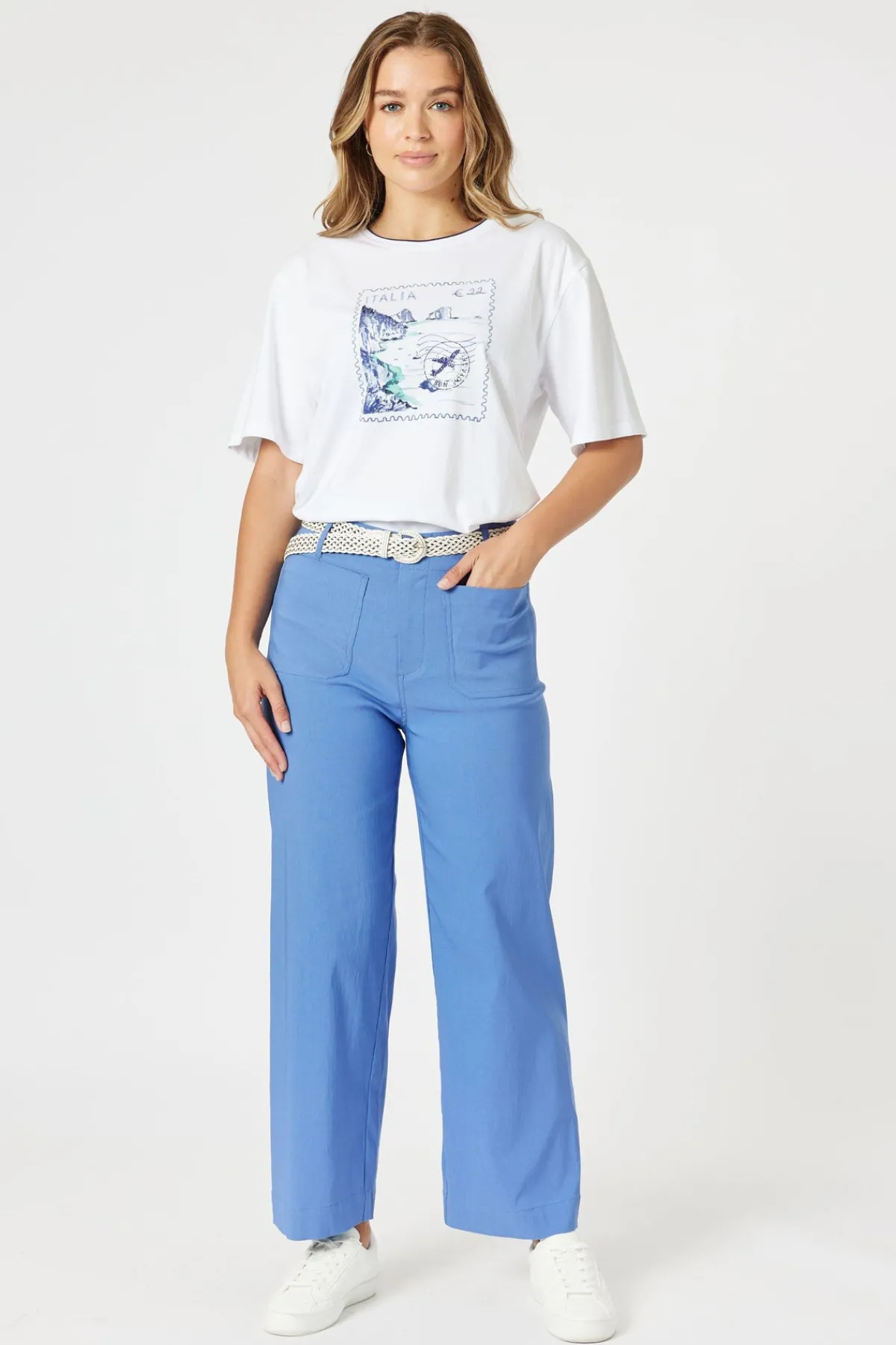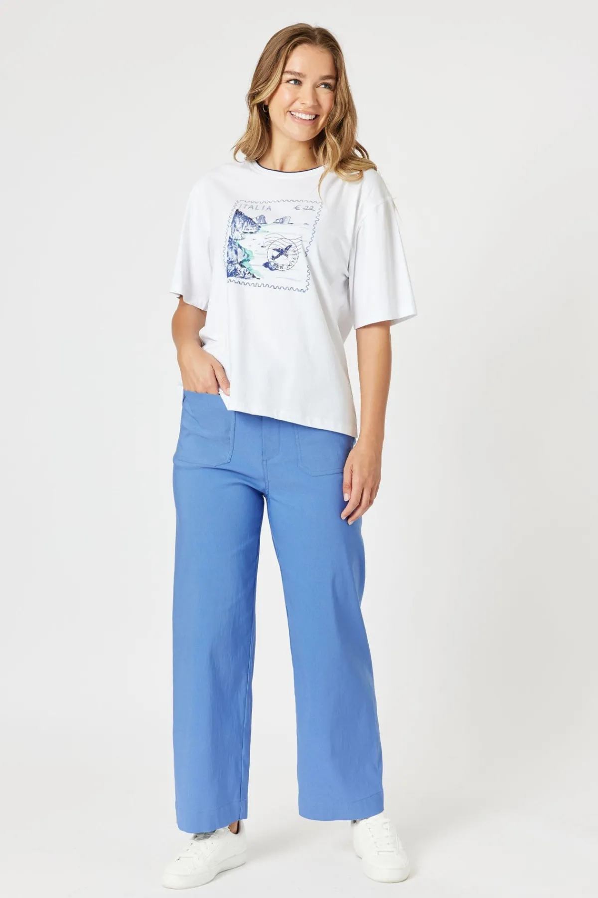 Celebrate la dolce vita with The Italia Tee, a crisp white cotton tee featuring a vintage Italian postage stamp print in shades of blue. Inspired by the stunning coastlines of Italy, this piece brings a touch of wanderlust to your everyday wardrobe. Lightweight and breathable, it features short sleeves and a round neckline finished with a navy trim for a polished detail.