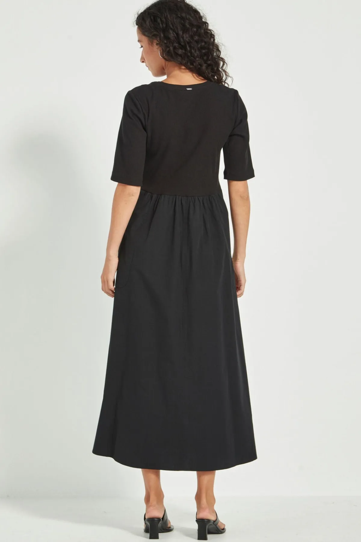 Effortlessly elegant, the Contessa Dress is designed to take you from day to night with ease. A high-waisted poplin skirt gathers softly to skim the hips, complemented by curved front pockets for a flattering, functional finish. The fitted ribbed bodice offers comfortable stretch, with a scoop neckline and slim elbow-length sleeves to balance the silhouette. Finished at a midi length, with a side zip for function, it’s the kind of piece you’ll reach for again and again.