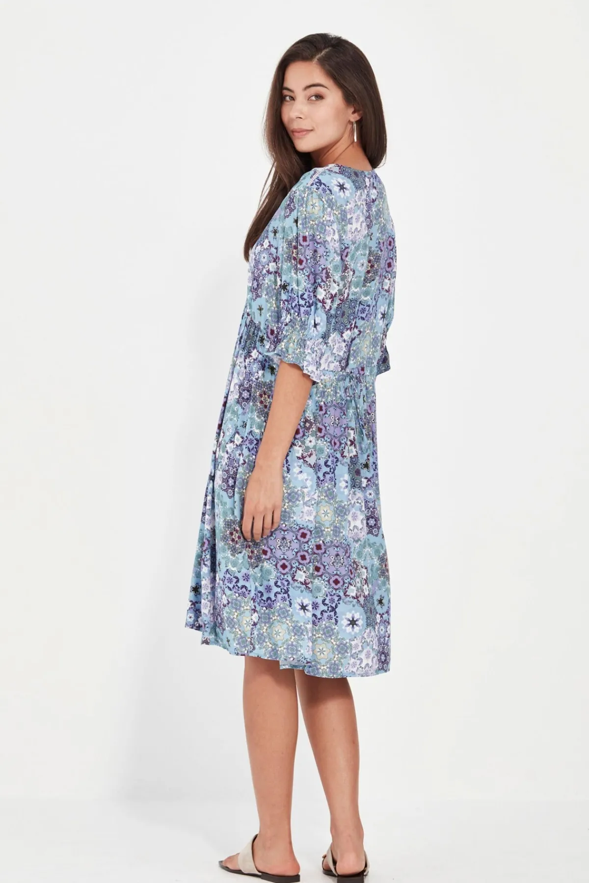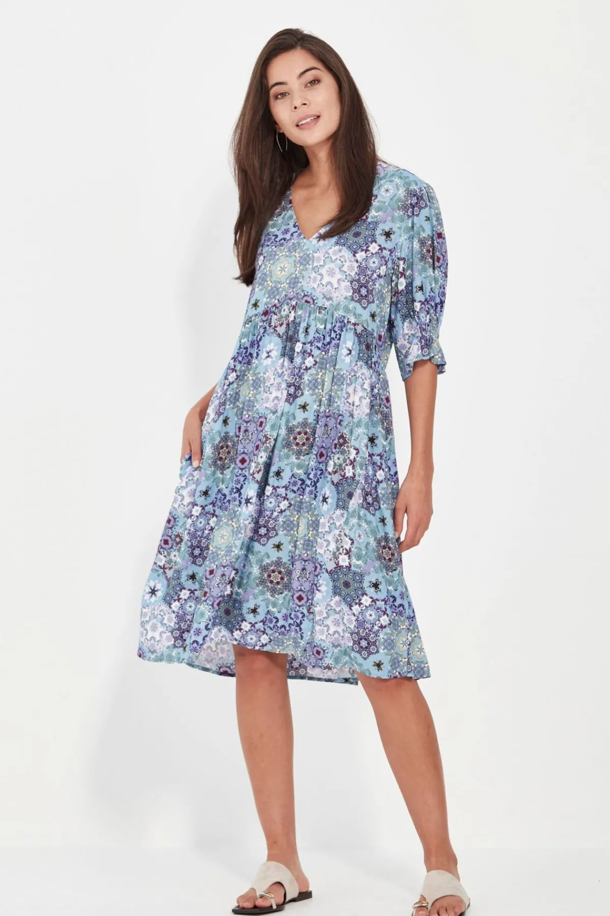 The Illusion Dress is crafted in soft-touch rayon and features an exclusive Verge print, offering both comfort and visual impact. A flattering V neckline is framed by ladder lace inserts across the shoulders for a touch of delicate detail. The bodice is shaped with an empire seam and gentle gathers to create a relaxed, feminine silhouette. Elbow-length puff sleeves finish with shirred elastic cuffs and a soft frill, adding volume without bulk. An adjustable drawcord at the back waist ensures a custom fit while maintaining a smooth, clean front. Panelled through the skirt for movement, the softly flared silhouette falls to just below the knee—effortless, flattering, and easy to wear.
