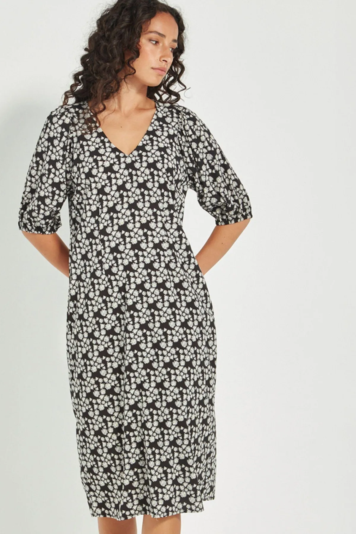 The Pixie Dress showcases the same delicate black and white ditzy print with a subtle hint of green. Crafted from stretch fabric, it is darted through the back for shape and features a back zip closure. Sleeves fall just above the elbow with elasticated hems, and the straight silhouette extends below the knee for a flattering, easy-to-wear style.