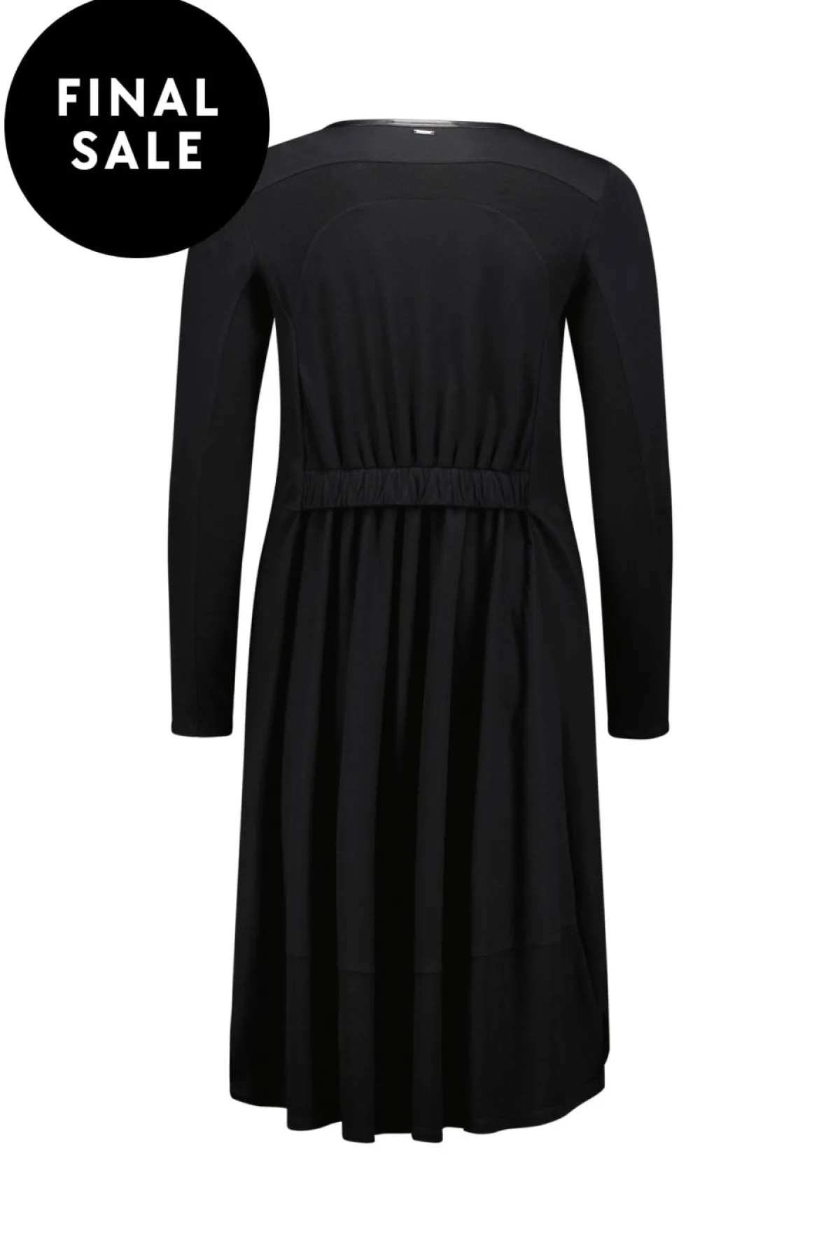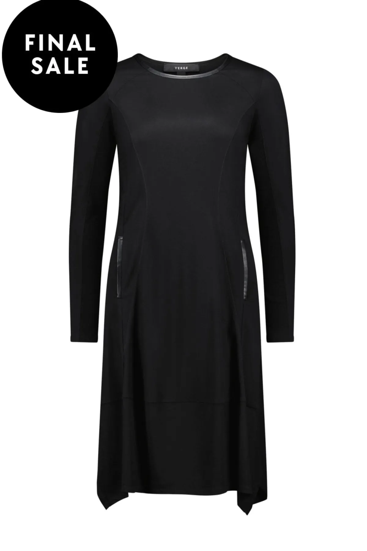 Knit dress with rib insert sleeve. Rounded neckline features Vegan leather trim. The Revolve dress is shaped with panels through the body. Vegan leather trimmed front pockets.The Revolve dress falls to mid calf.