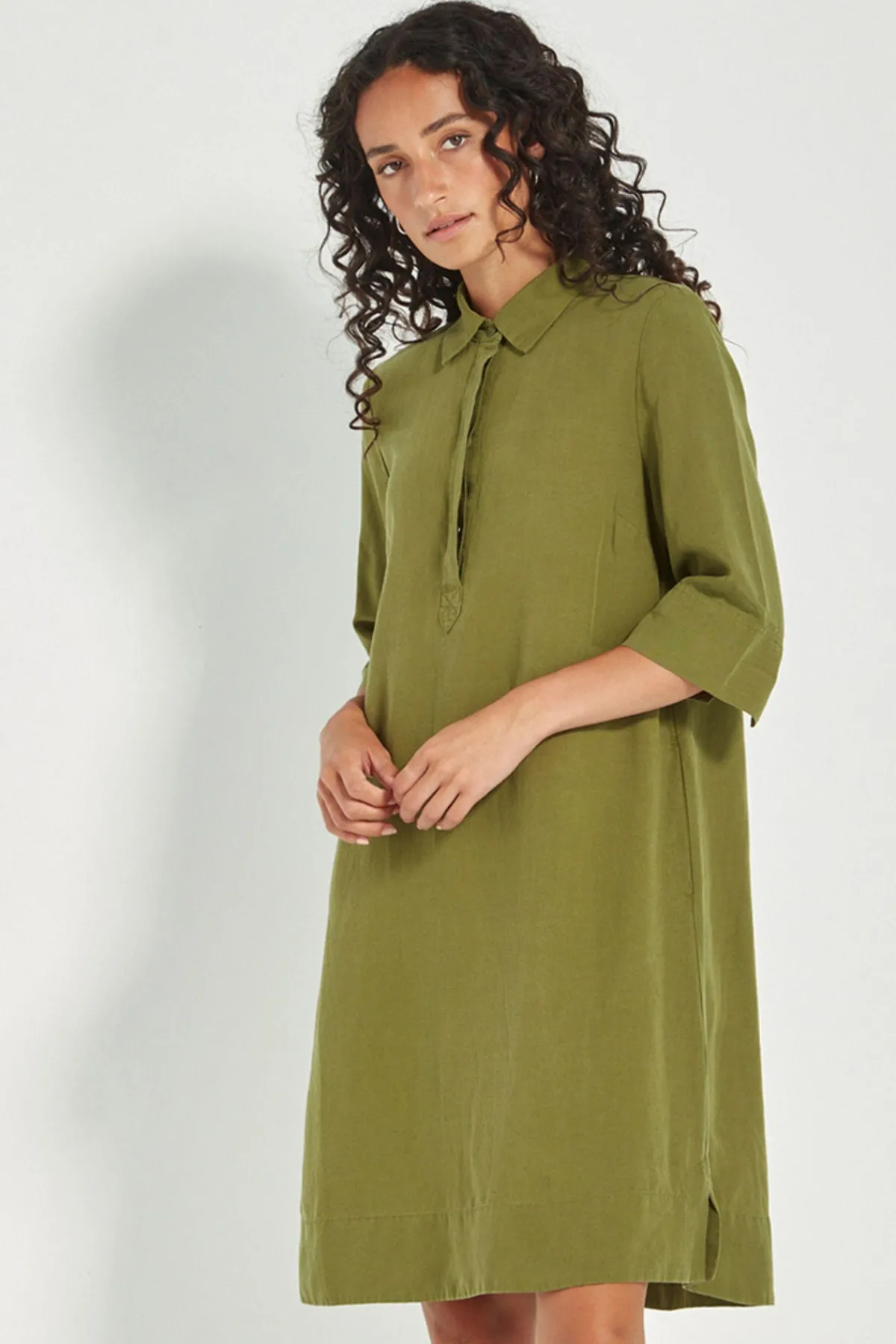 The Seville Dress is a relaxed yet refined shift silhouette crafted from lightweight Tencel linen. It features a stand collar, a half-placket front, and elbow-length straight sleeves finished with split cuffs. An inverted pleat at the back adds ease of movement, creating a timeless design that flatters all body shapes.