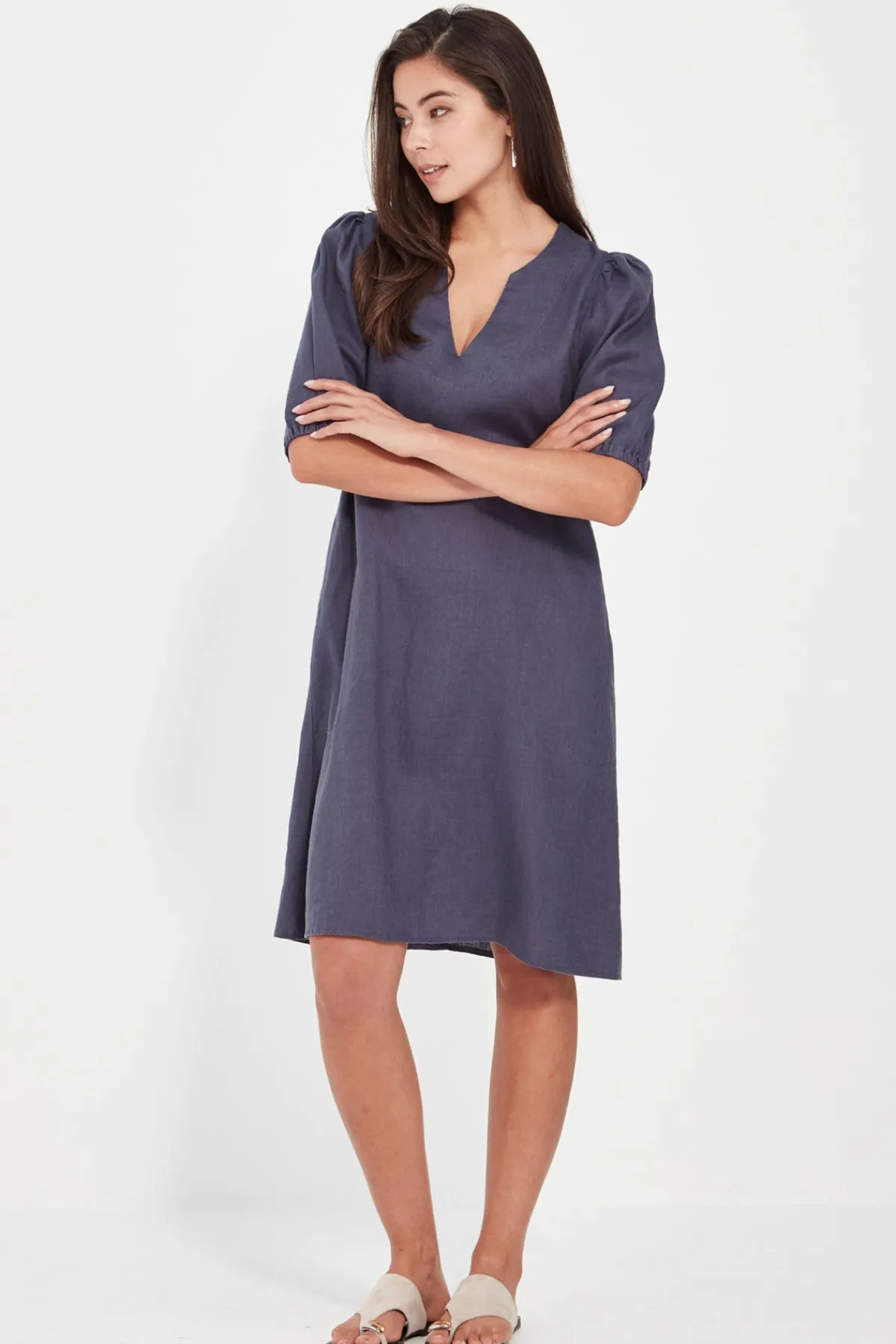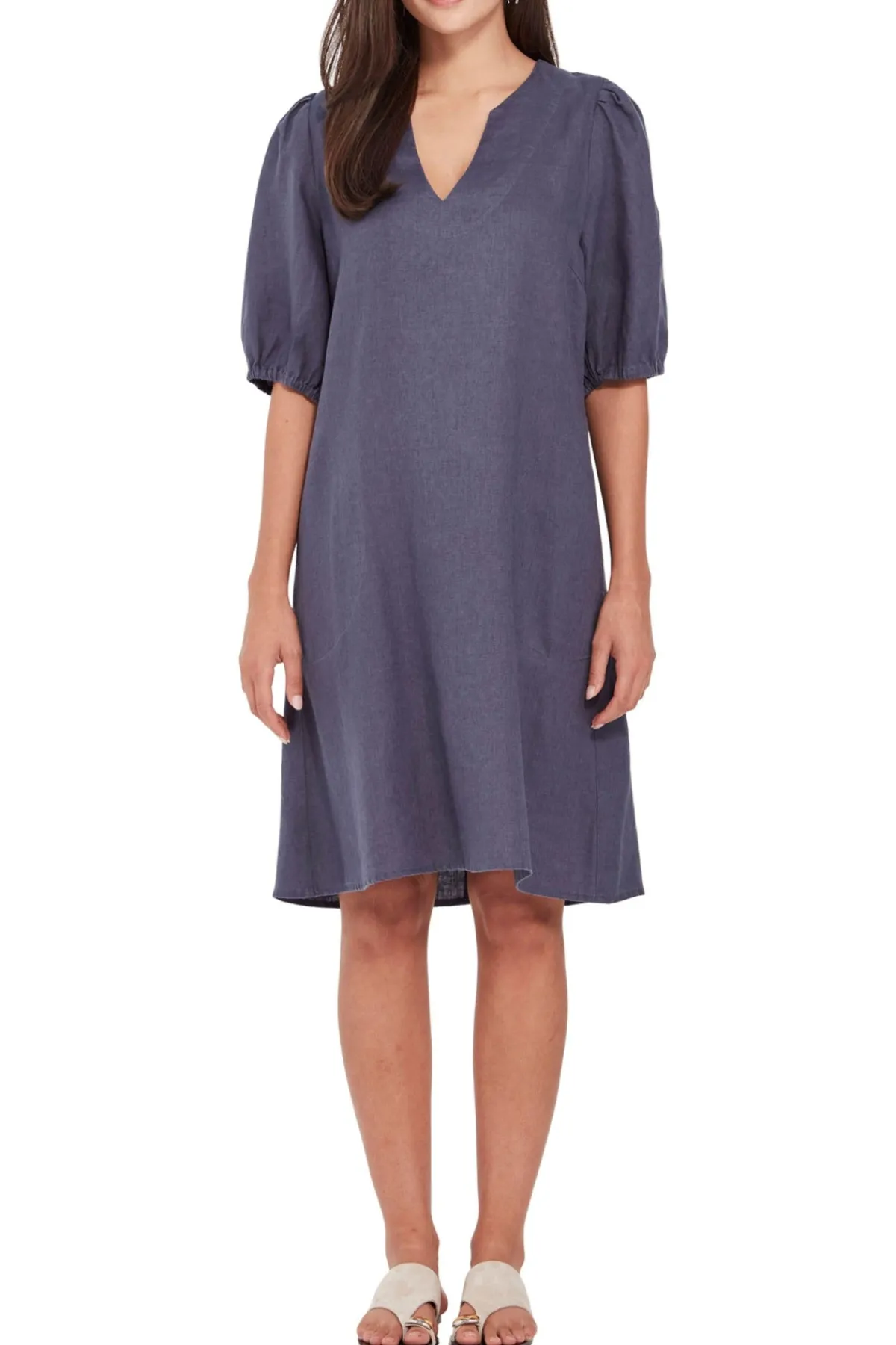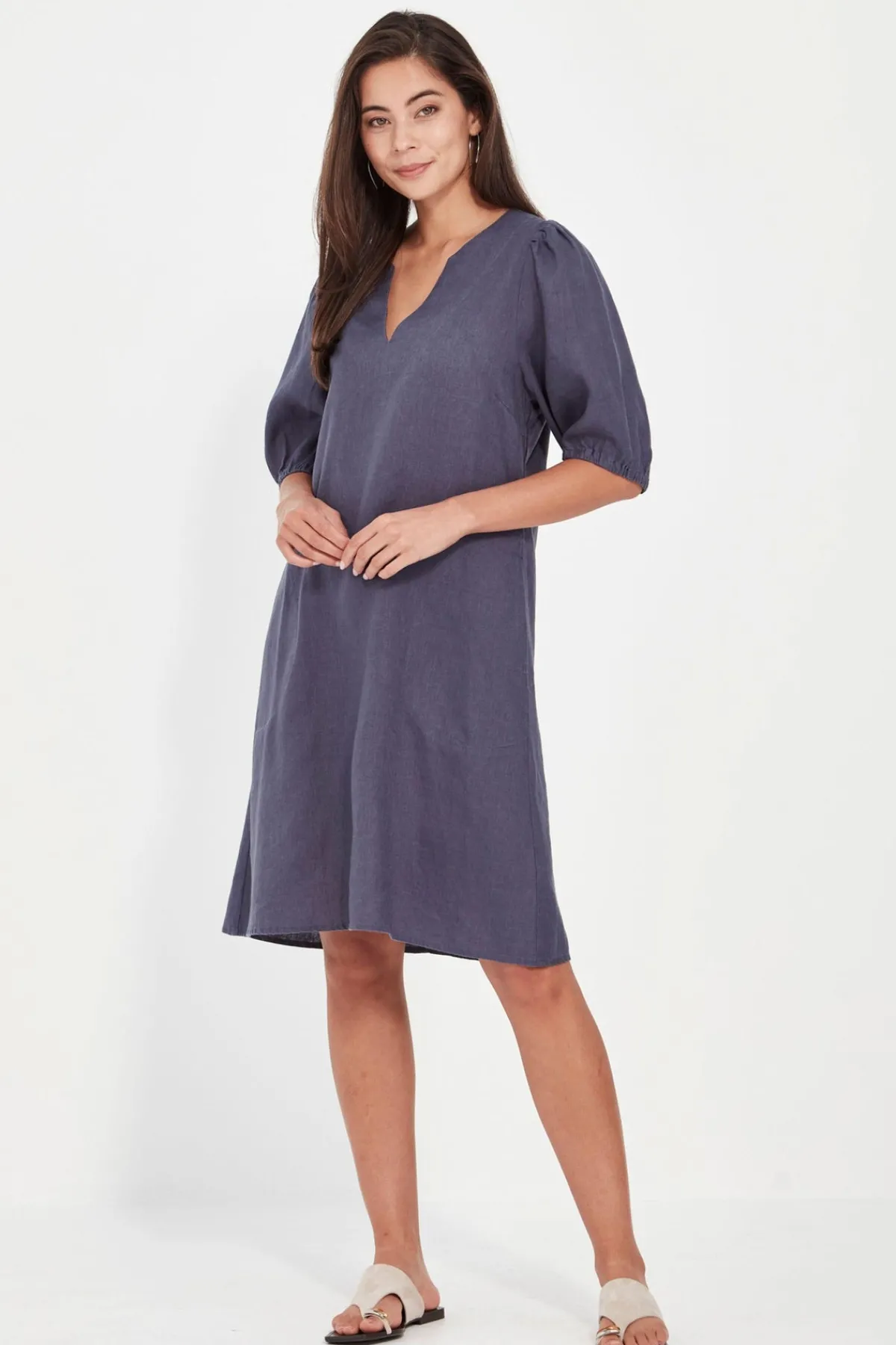 The Becky Dress is a breezy shift silhouette crafted in 100% linen—lightweight, breathable, and perfect for warmer days. Falling to just above the knee, it features a flattering scoop V-neckline and voluminous elbow-length sleeves with elasticated cuffs for a soft, gathered finish. Stitched side pockets add practical charm, while the easy fit and clean lines make it a timeless piece you’ll reach for again and again.