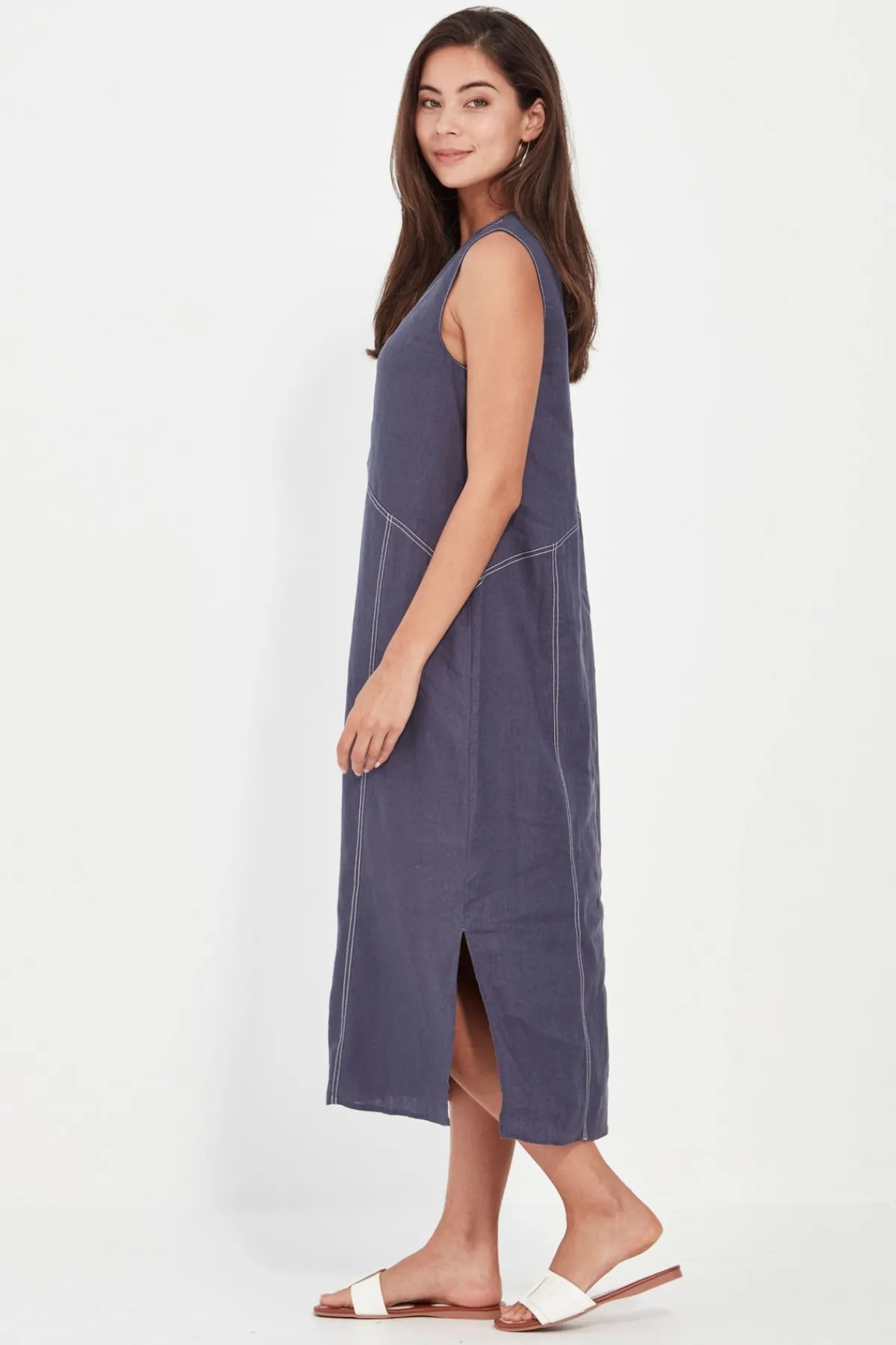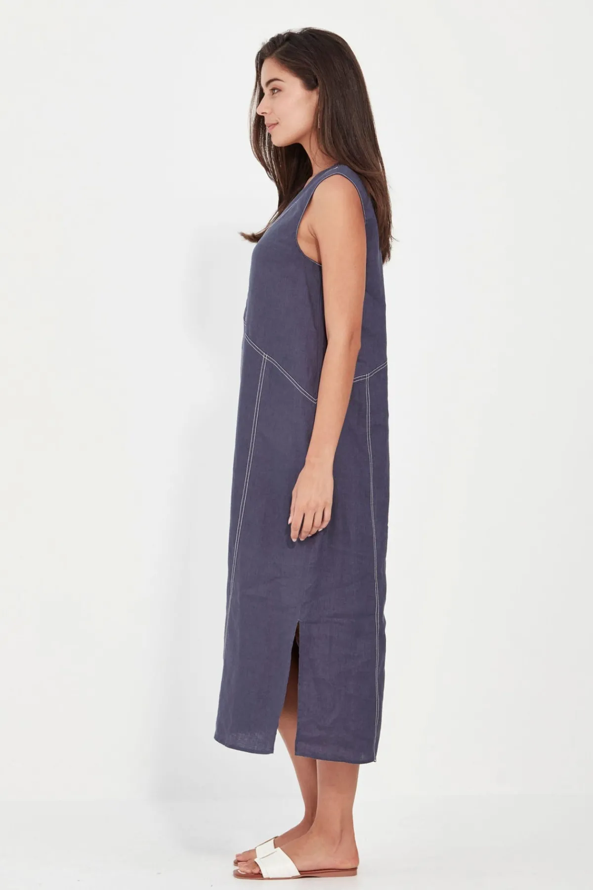 The Cordelia Dress is crafted from 100% linen in a sleeveless V-neck silhouette with contrast topstitching detail. Cut in a straight fit that flatters the body, it falls to mid-calf with side splits for ease and movement. Effortlessly versatile—wear it casually or dress it up for dinner.