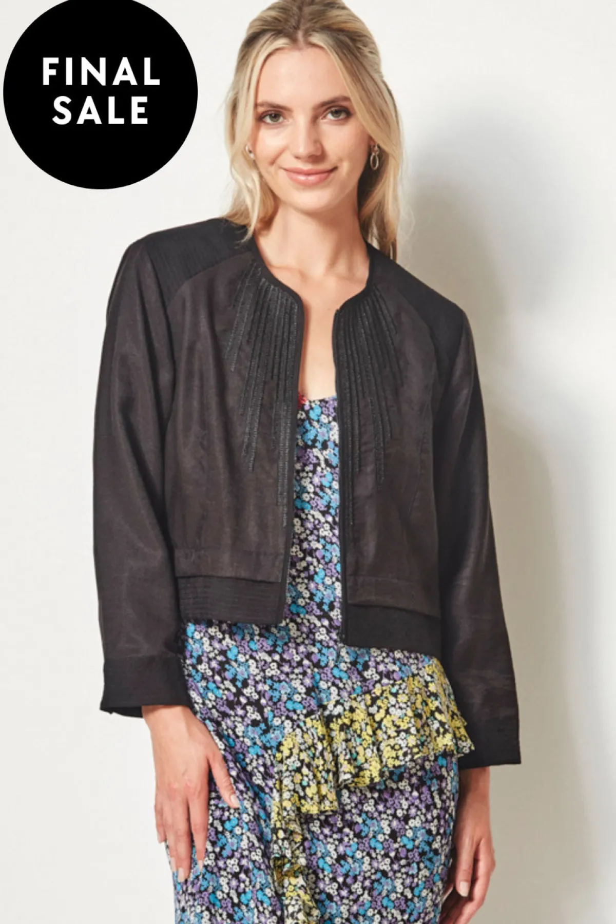 This full lined cropped jacket boasts a sophisticated zip front and collarless design. Stand out with the exquisite embroidered neckline and waist-length cut. Elevate your style with the Grade jacket, the perfect addition to your wardrobe.