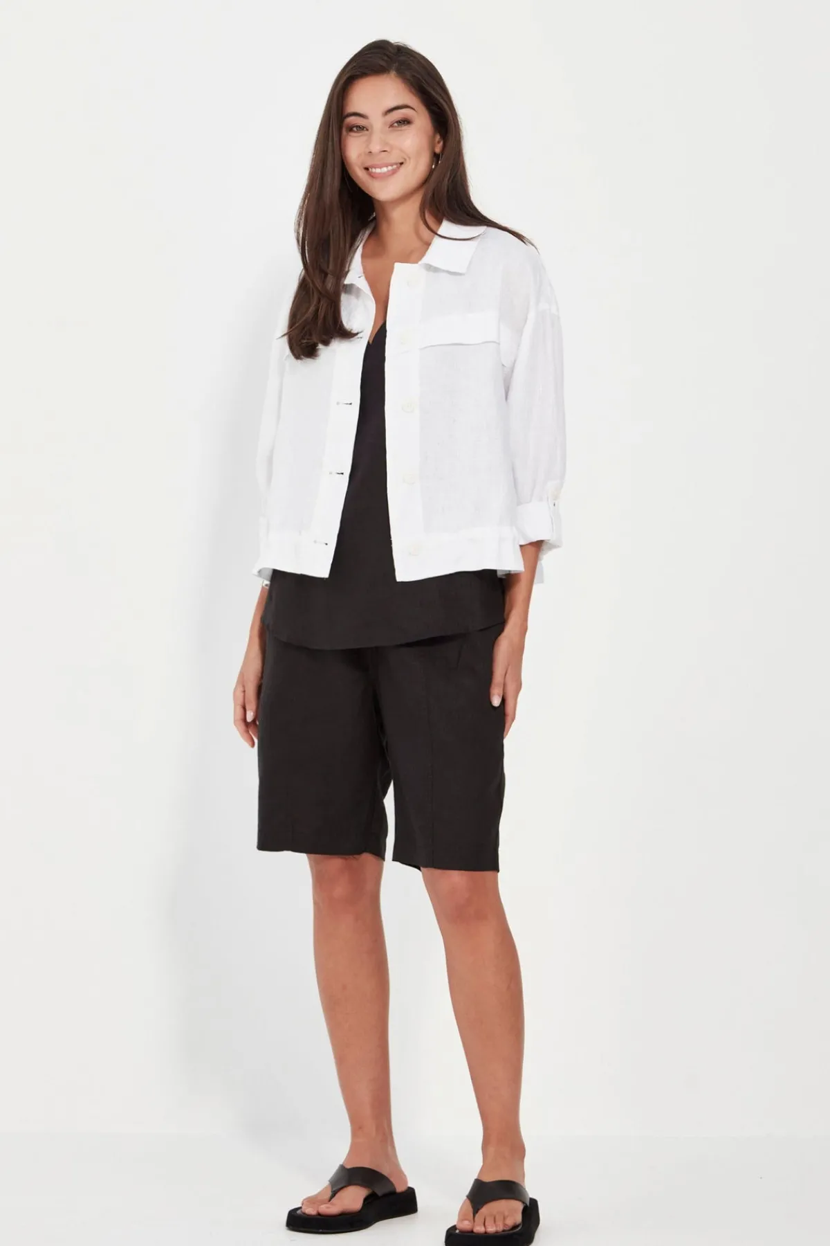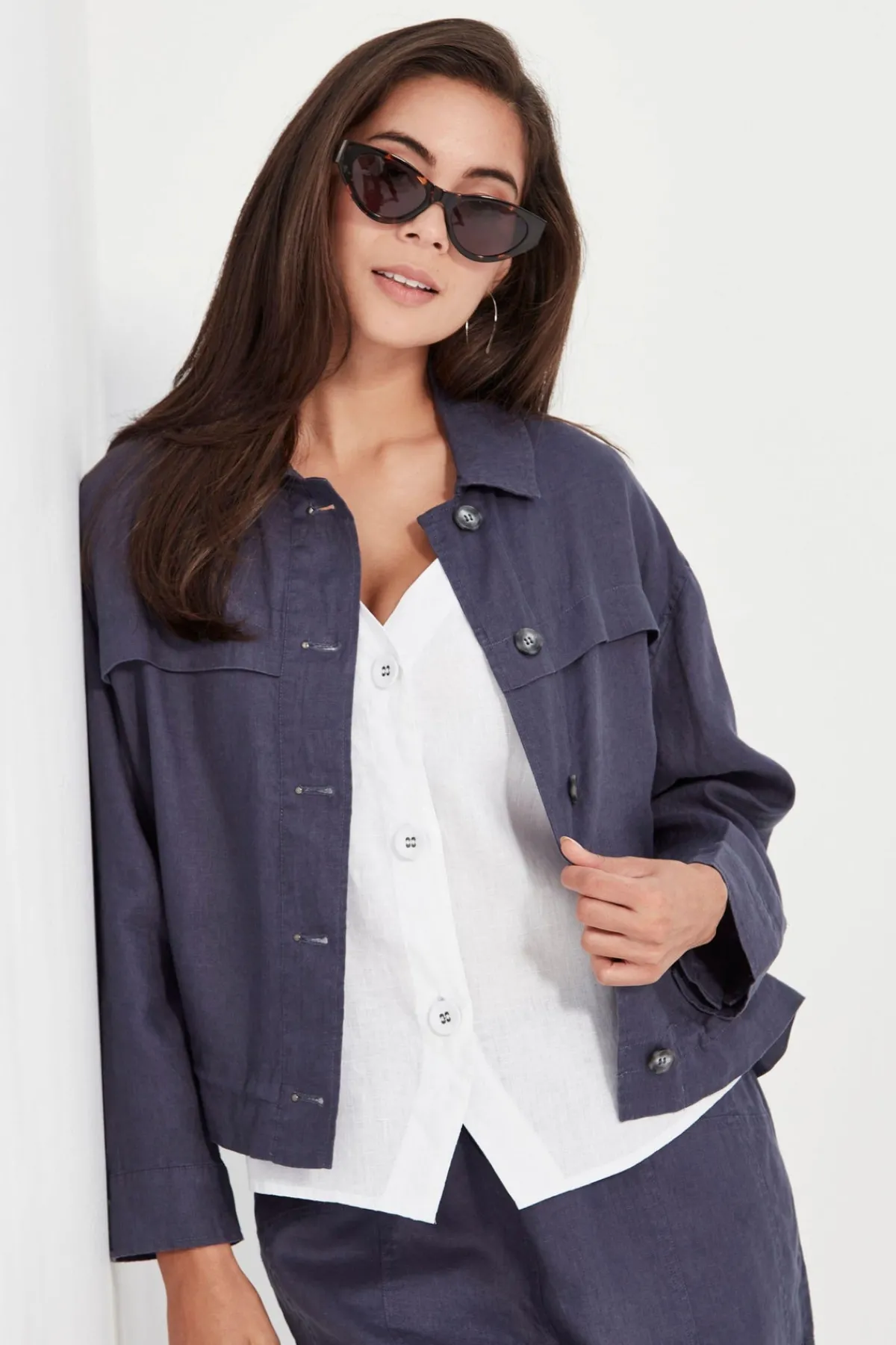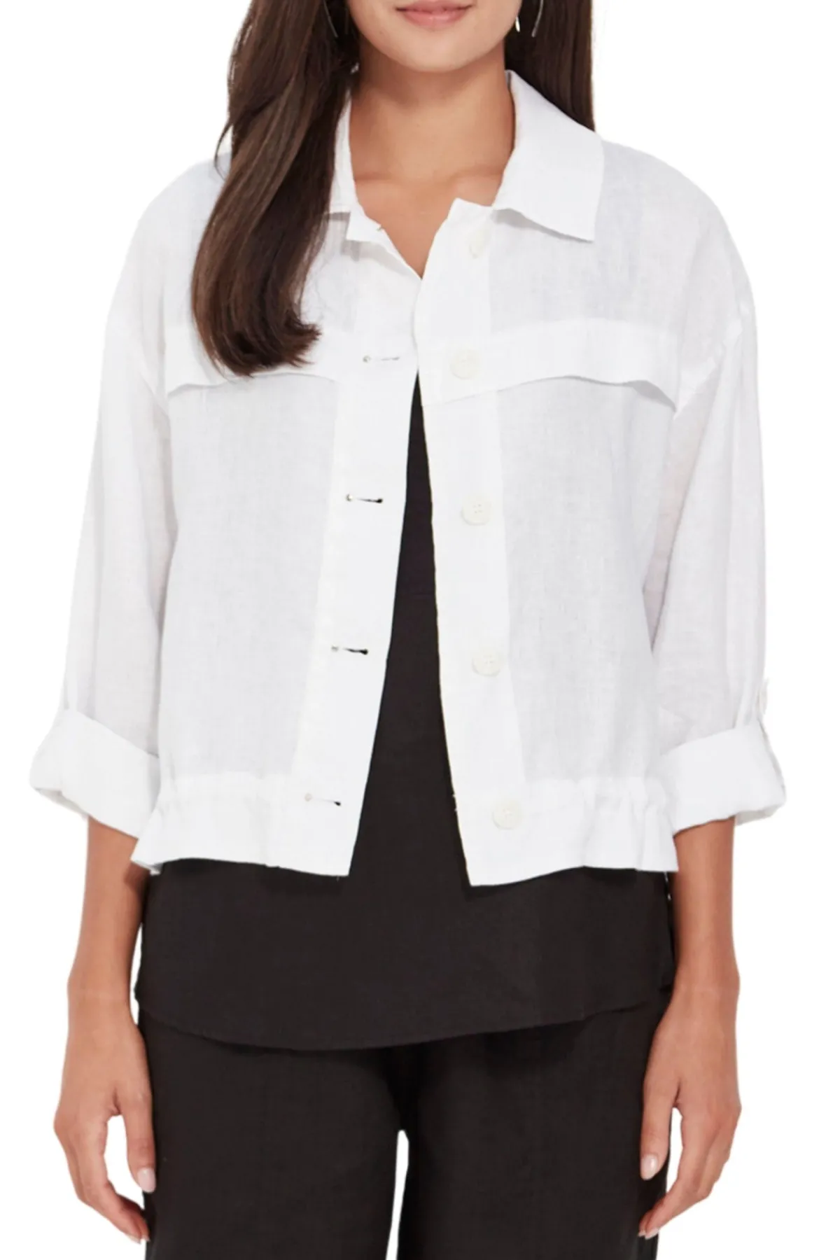 The Echo Jacket is a relaxed-fit utility style crafted from 100% linen. It features a button front, classic collar, and full-length sleeves that can be rolled to the elbow with a button tab. An internal drawcord allows you to cinch the waist for shape. Lightweight and versatile, it pairs perfectly with pants or works as an easy summer layer over dresses.