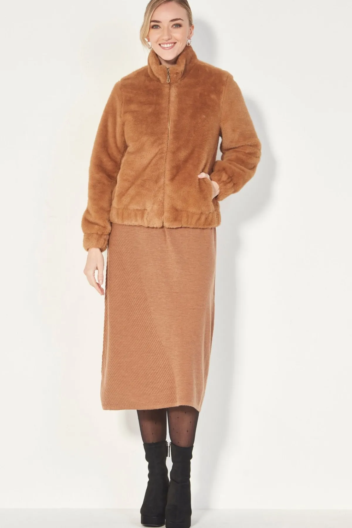 Faux fur bomber jacket with front zip entry and high collar. Zip goes up to the top of the collar. Full length sleeve with concealed elasticated cuff. The Parade jacket falls to the hip with concealed elasticated hemline.