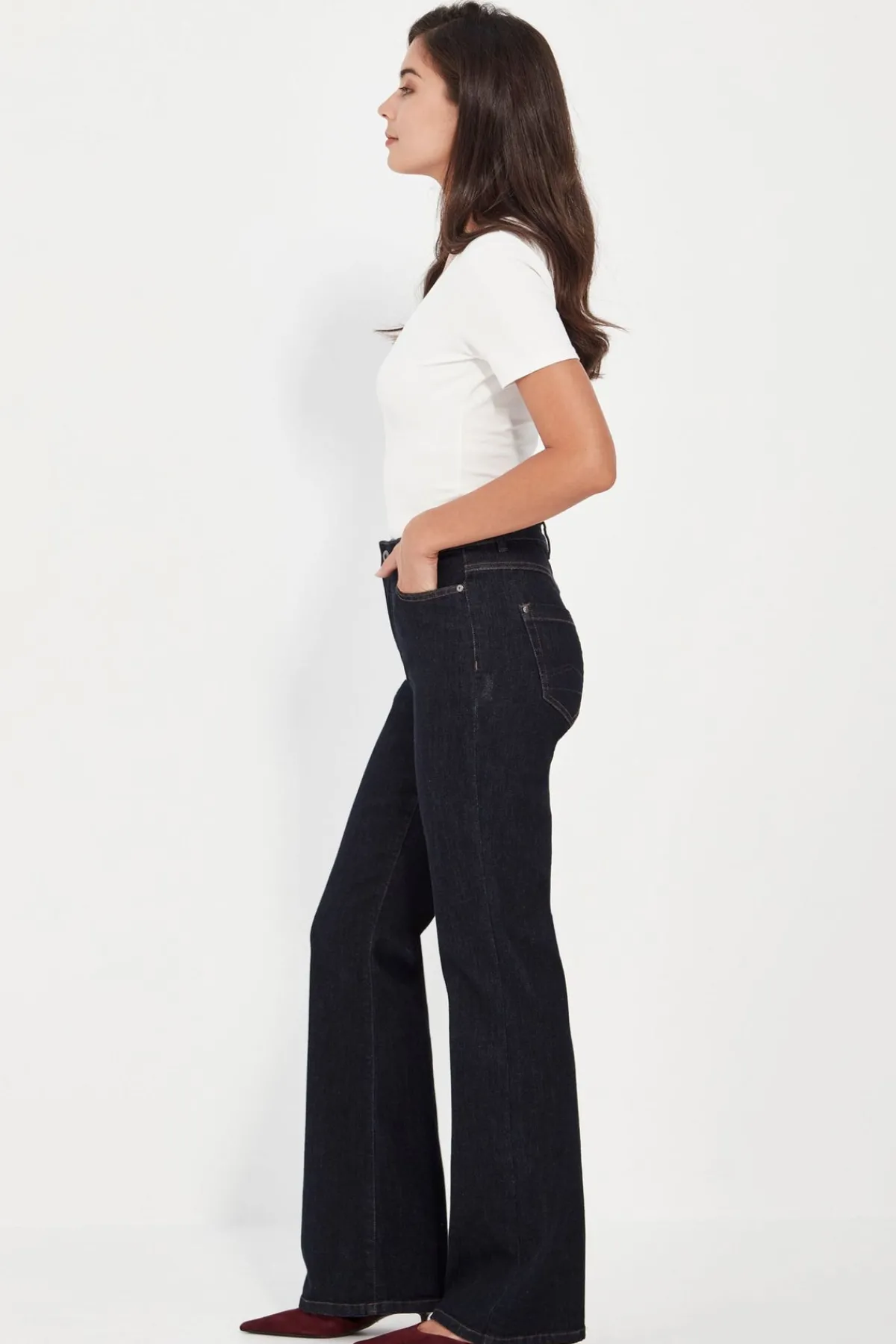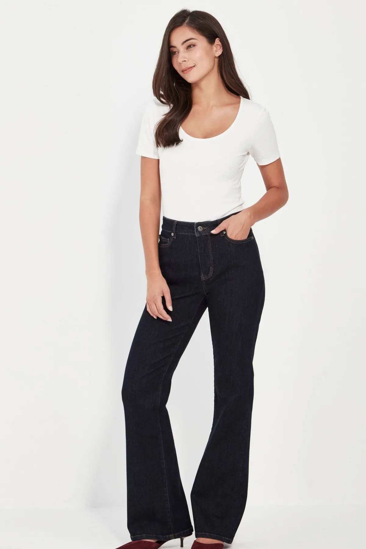 Made from high quality stretch denim, this classic 5 pocket jean provides both comfort and style. The bootcut design works for every body shape, making these the perfect choice for all-day wear. Upgrade your wardrobe with these versatile and timeless dark wash jeans. 5 Pocket stretch dark wash denim jean. Full length. Bootcut.