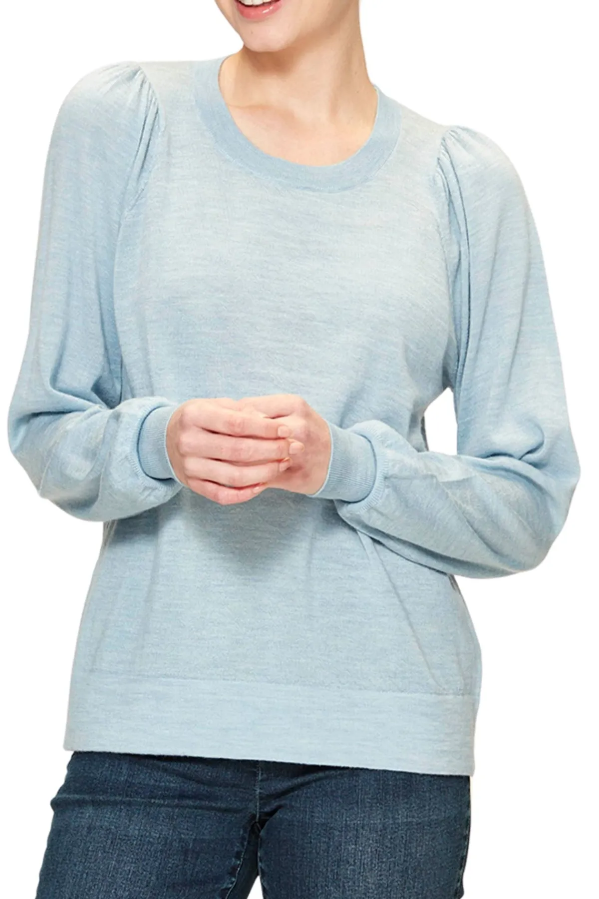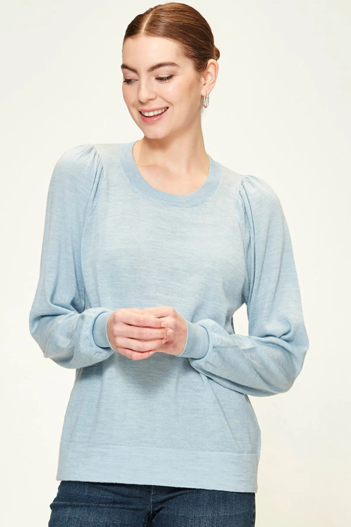 The Bronte Sweater is 100% Merino with a rounded neckline and gather details on shoulder.Bracelet length sleeve with deep rib cuff.The Bronte Sweater falls to the hip.