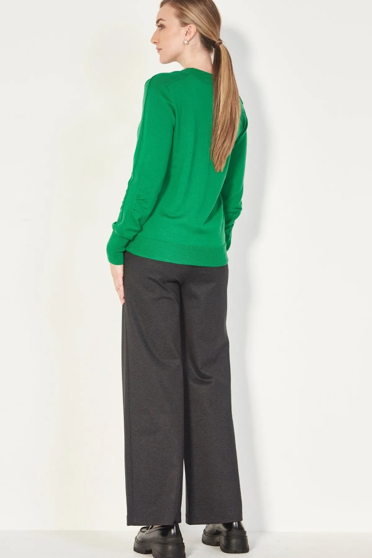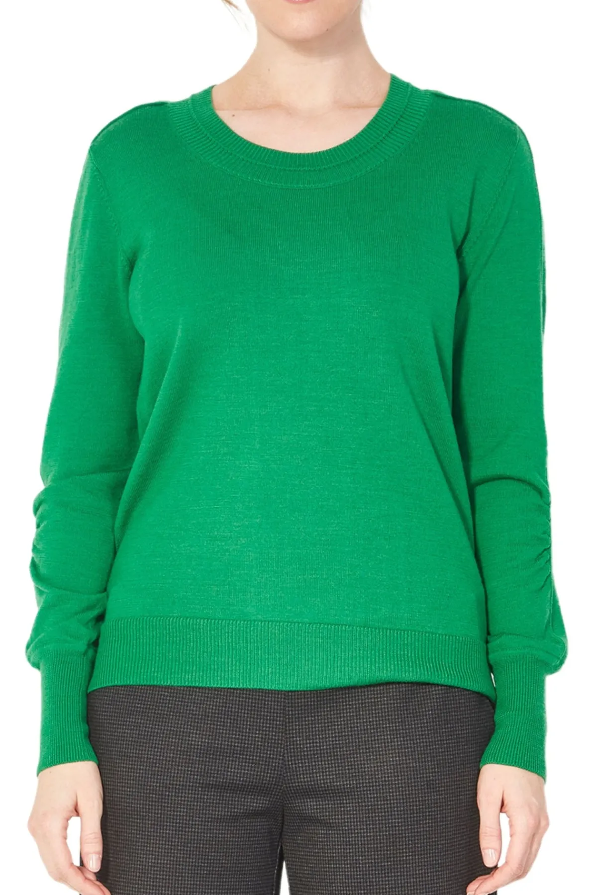 100% Merino sweater ribbed, scoop crewneck. Set in sleeve with seam detail on shoulder and along the arm. Full length sleeve with deep rib cuff and ruched detail on elbow. The Cole sweater falls below the hip with ribbed hem.