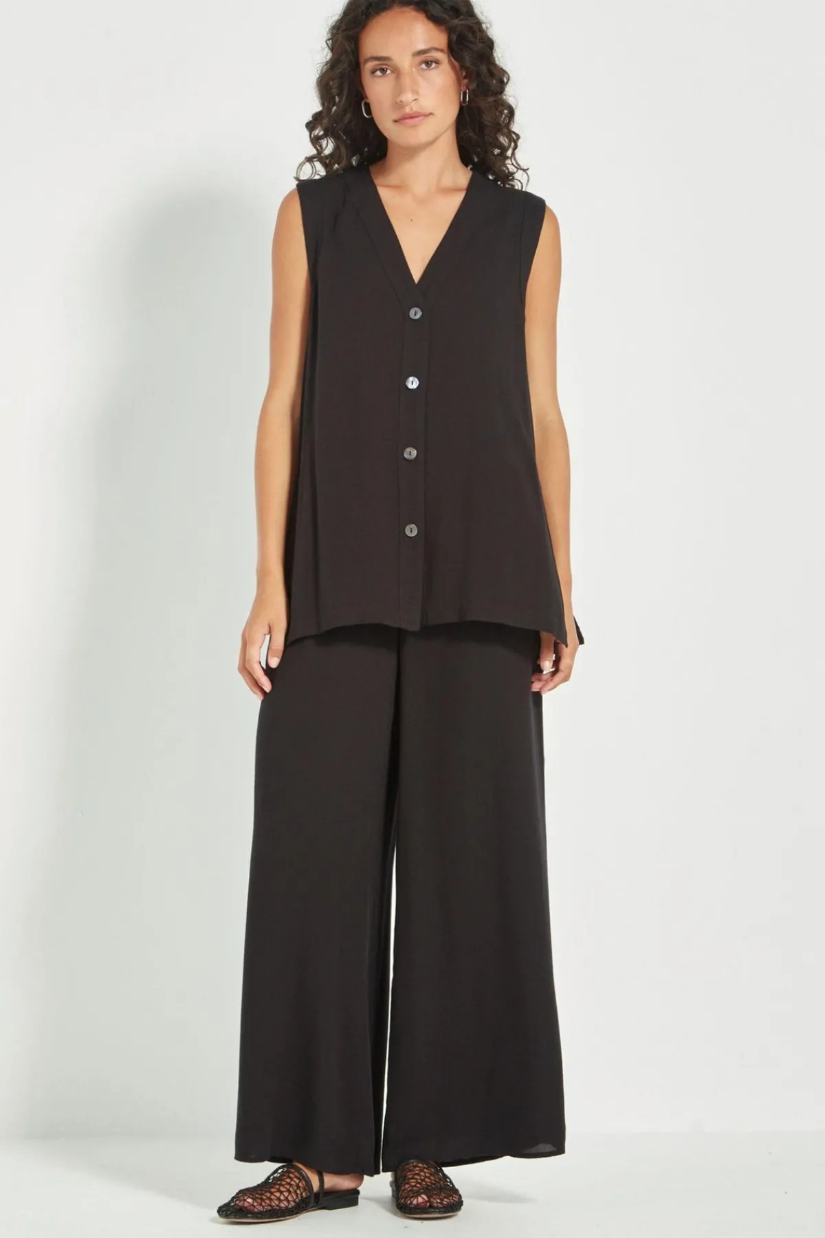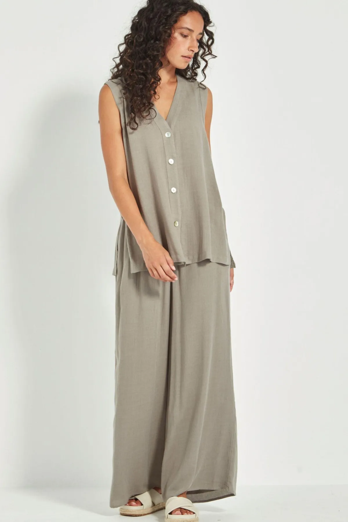 Relaxed elegance in every detail. The Cayman Pant is cut in a soft weave mesh and designed with a full-length wider leg silhouette, elasticated waistband, and slant side pockets for everyday ease. Fully lined in self-fabric for a fluid, seamless feel. Complete your look by pairing it with the coordinating Cayman Vest and Jacket for an effortlessly refined outfit.
