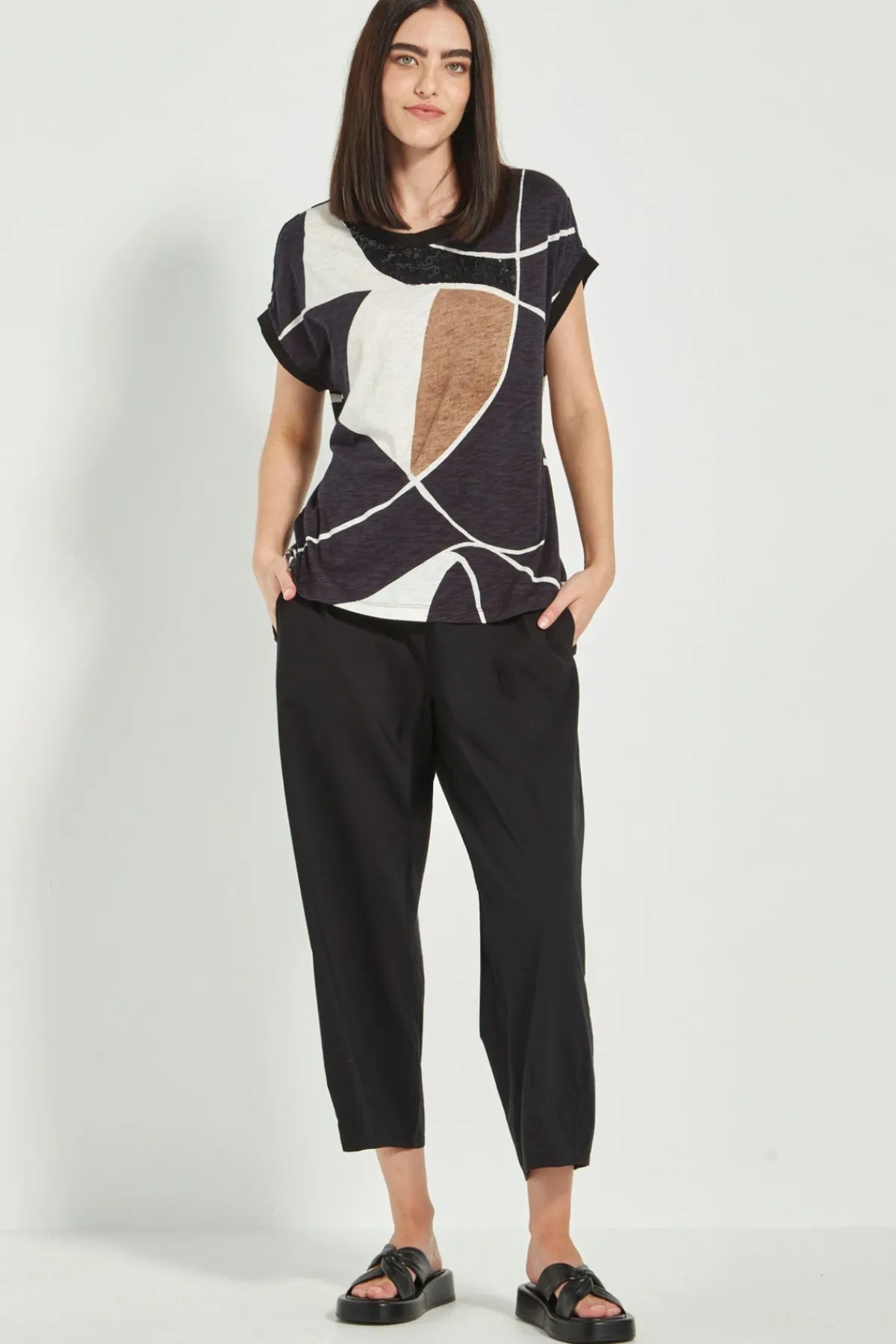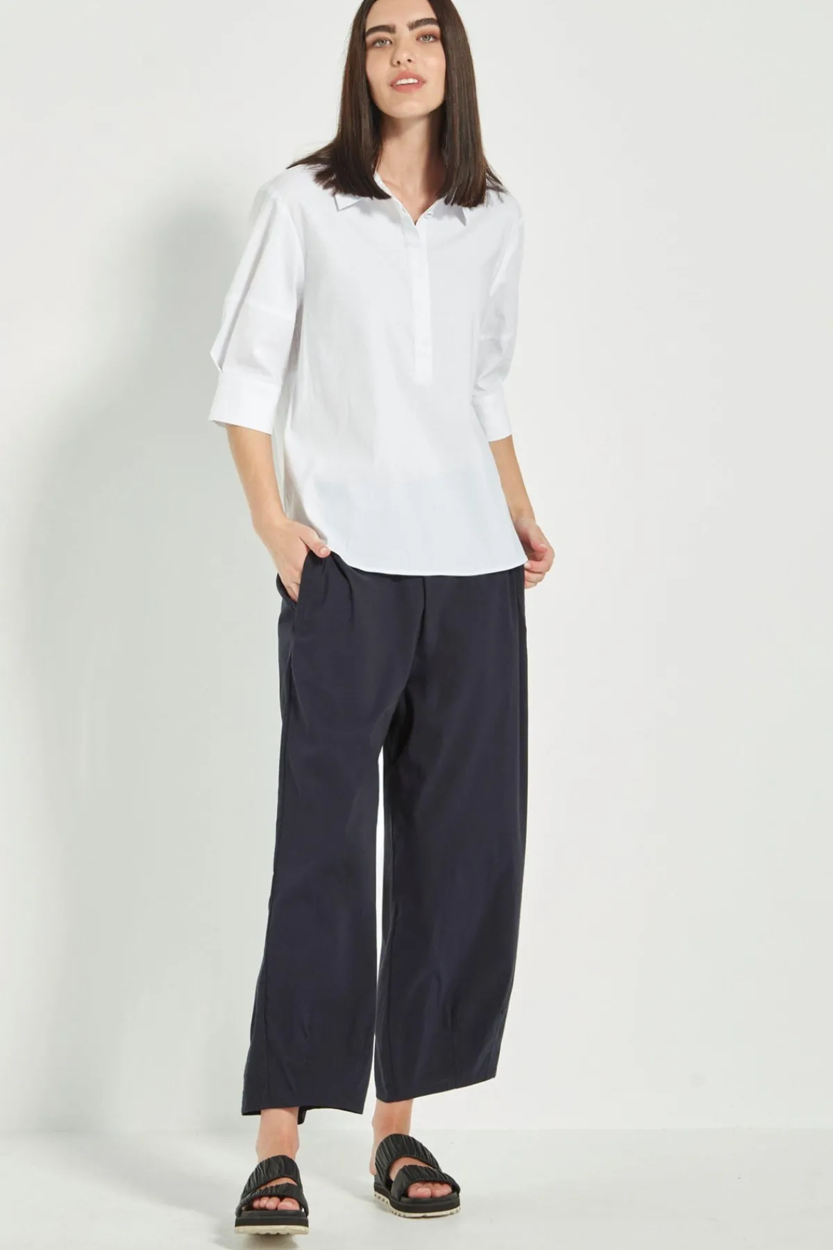 For lovers of the tapered barrel leg, the Acrobat Cove Pant offers a full-leg silhouette with the comfort of Acrobat fabric. It features an easy elasticated back waistband, flat front, slant pockets, and a 7/8 length. Modern styling is enhanced by dart details that taper the hem for a polished finish.