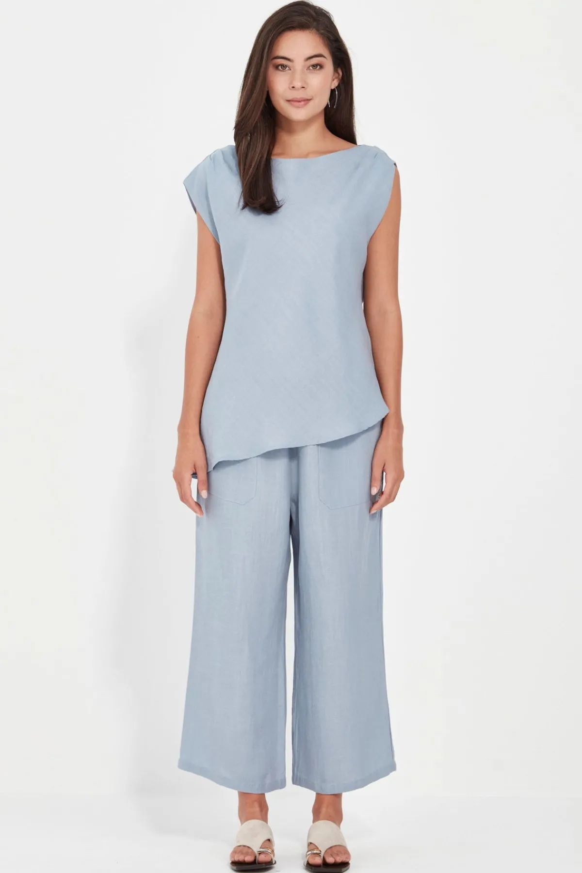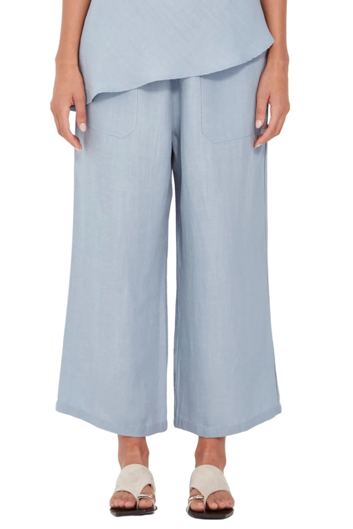 The Soho 3/4 Pant is crafted in a soft tencel-linen blend for breathability with a polished finish. Designed with a narrow elastic waistband and adjustable ties for all-day comfort, it features slant pockets and a wide, cropped leg that falls to mid-calf. An easy pull-on style that pairs effortlessly with relaxed tops or structured layers.