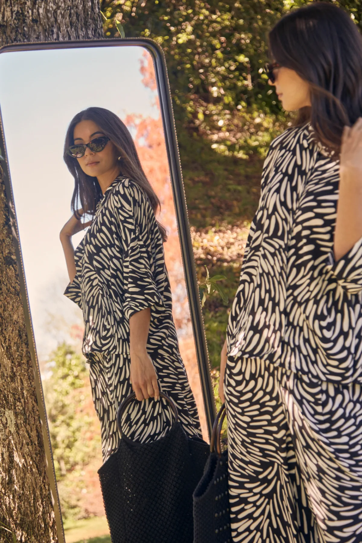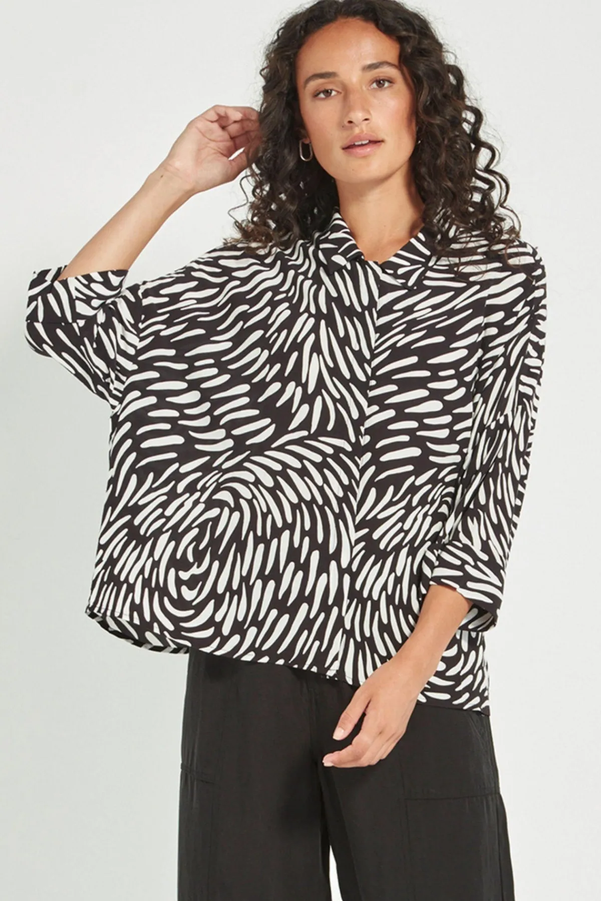 Crafted in a soft rayon-viscose blend, the Tidal Shirt is an easy, boxy silhouette elevated by a bold black-and-white abstract print. It features a clean concealed front placket, dropped shoulders, and 3/4-length cuffed sleeves for a relaxed yet modern finish. A versatile style that works just as well tucked in or worn loose. Wear with the Tidal Pant for a modern outfit solution.