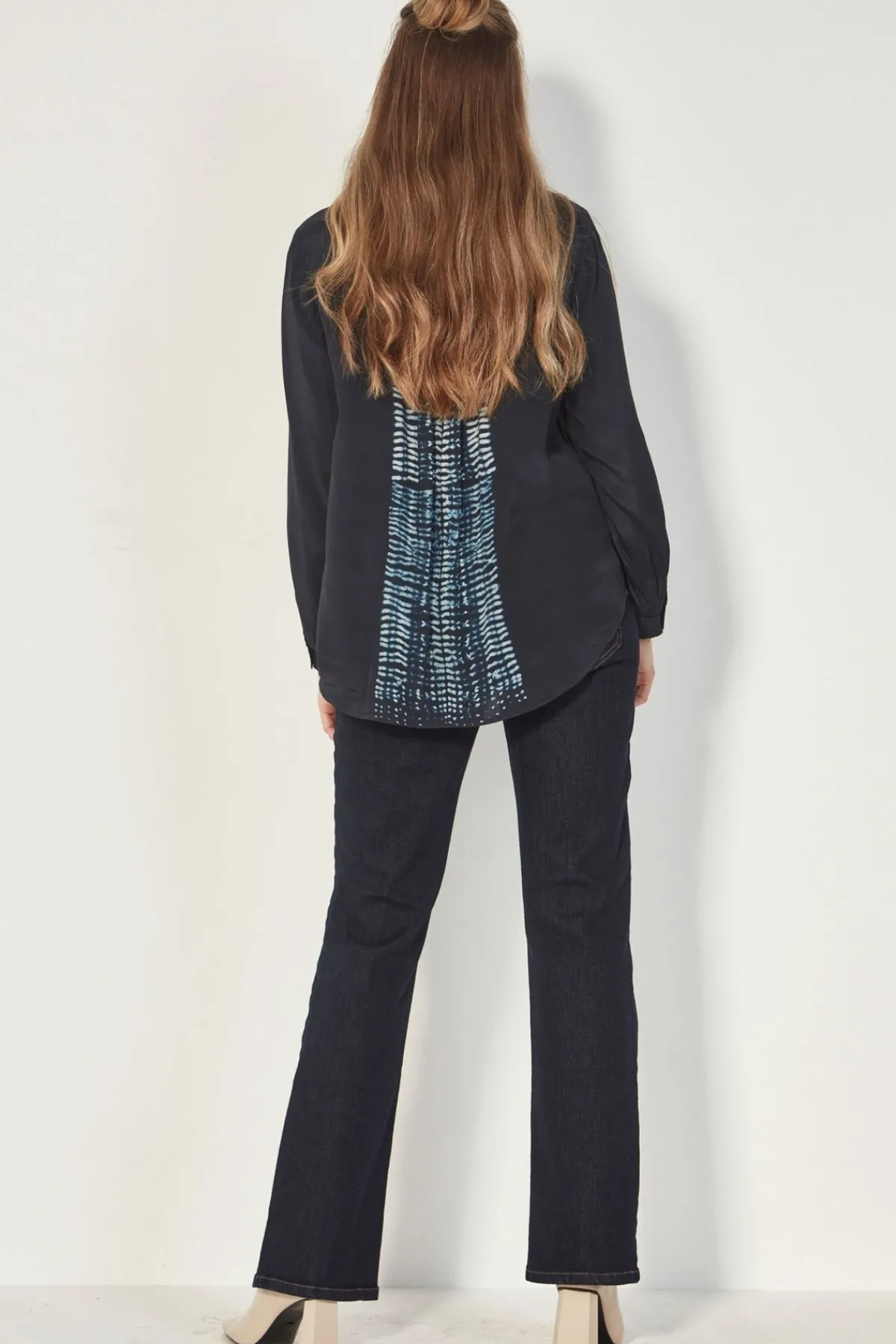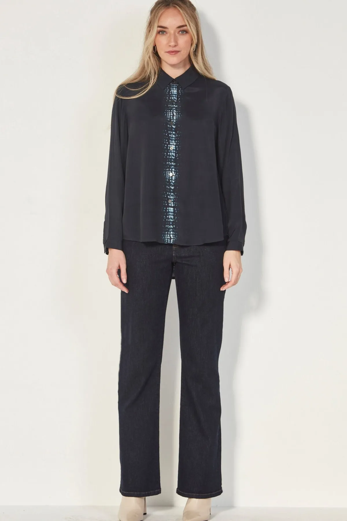 Experience timeless elegance with the Rena shirt. Its classic button through collared design is enhanced with a unique print detail on the front placket and centre back. The deep back yoke and flared back create a flattering silhouette, while the bracelet length sleeves and high low hemline add a chic touch. Make a statement with this versatile and stylish shirt. Classic button through collared shirt with feature print detail on front placket. Deep back yoke with flared back and feature print on centre back. Bracelet length sleeve with button cuff. High low hemline falls below the hip.