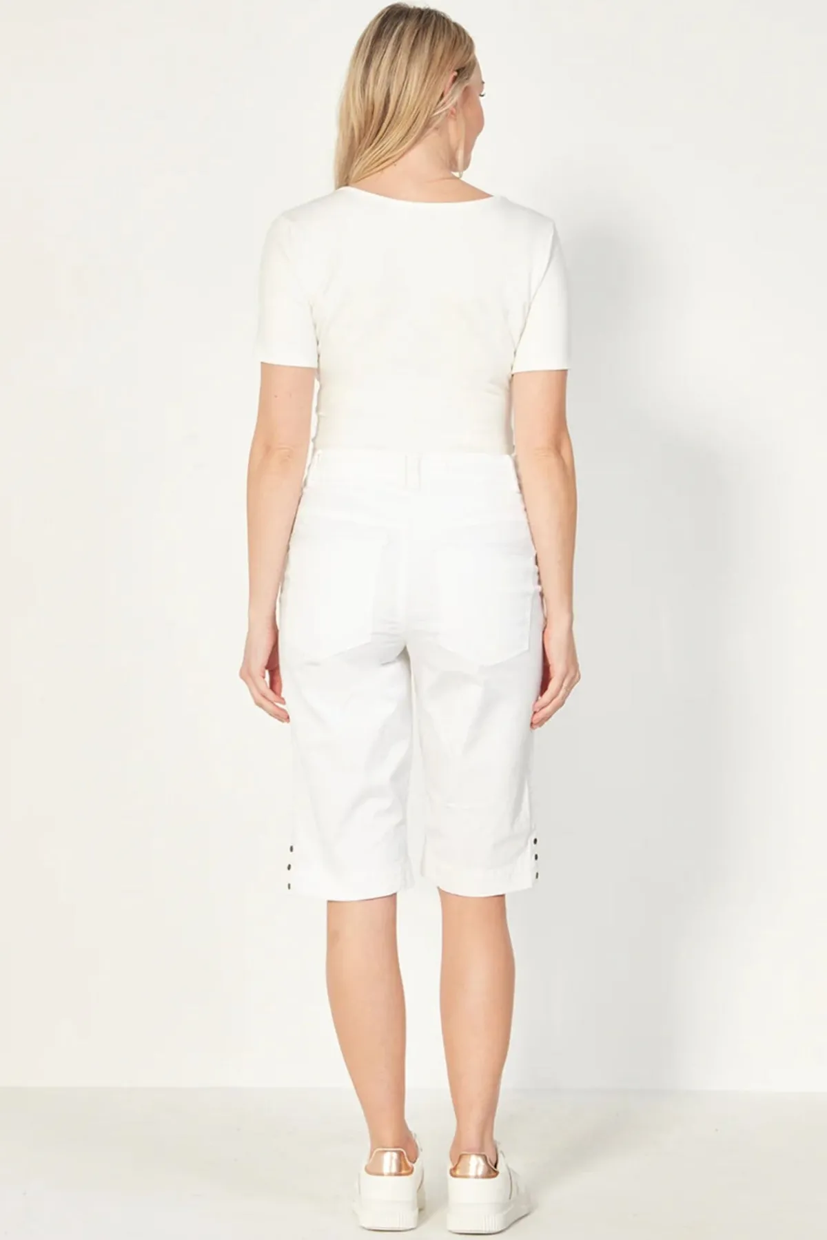 Super stretch cotton shorts with stud detail on the side split. Fly front with button closure. Angled side pockets. Back pockets with tape trim.