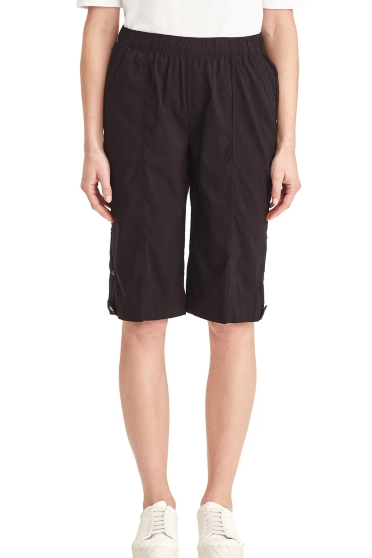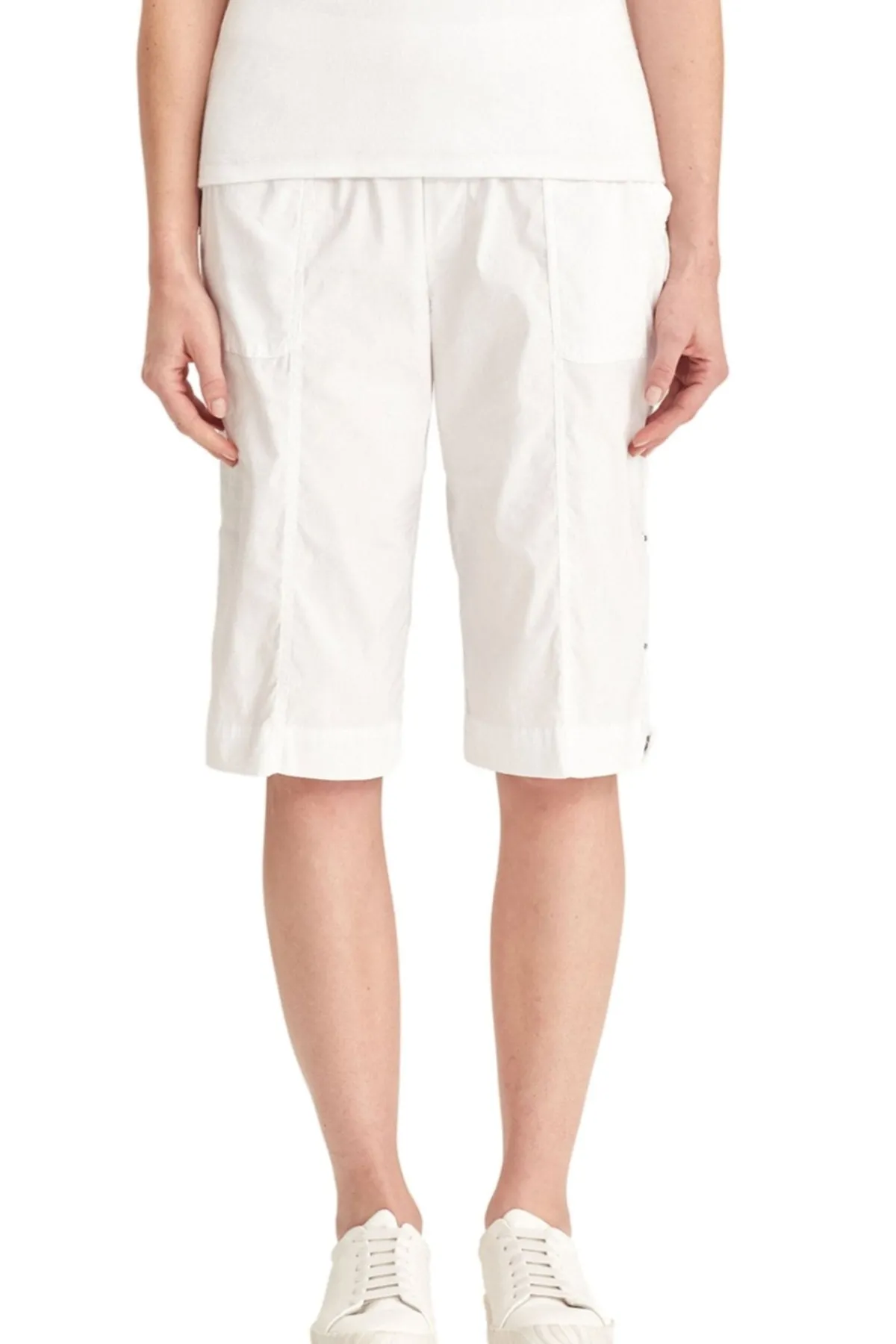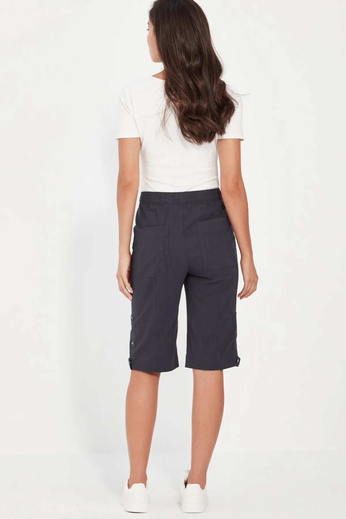 Knee length Acrobat stretch short features an easy wearing elasticated waist, patch pockets with rivet details on front and back with tabs at side to roll up hem. A classic short for every wardrobe.