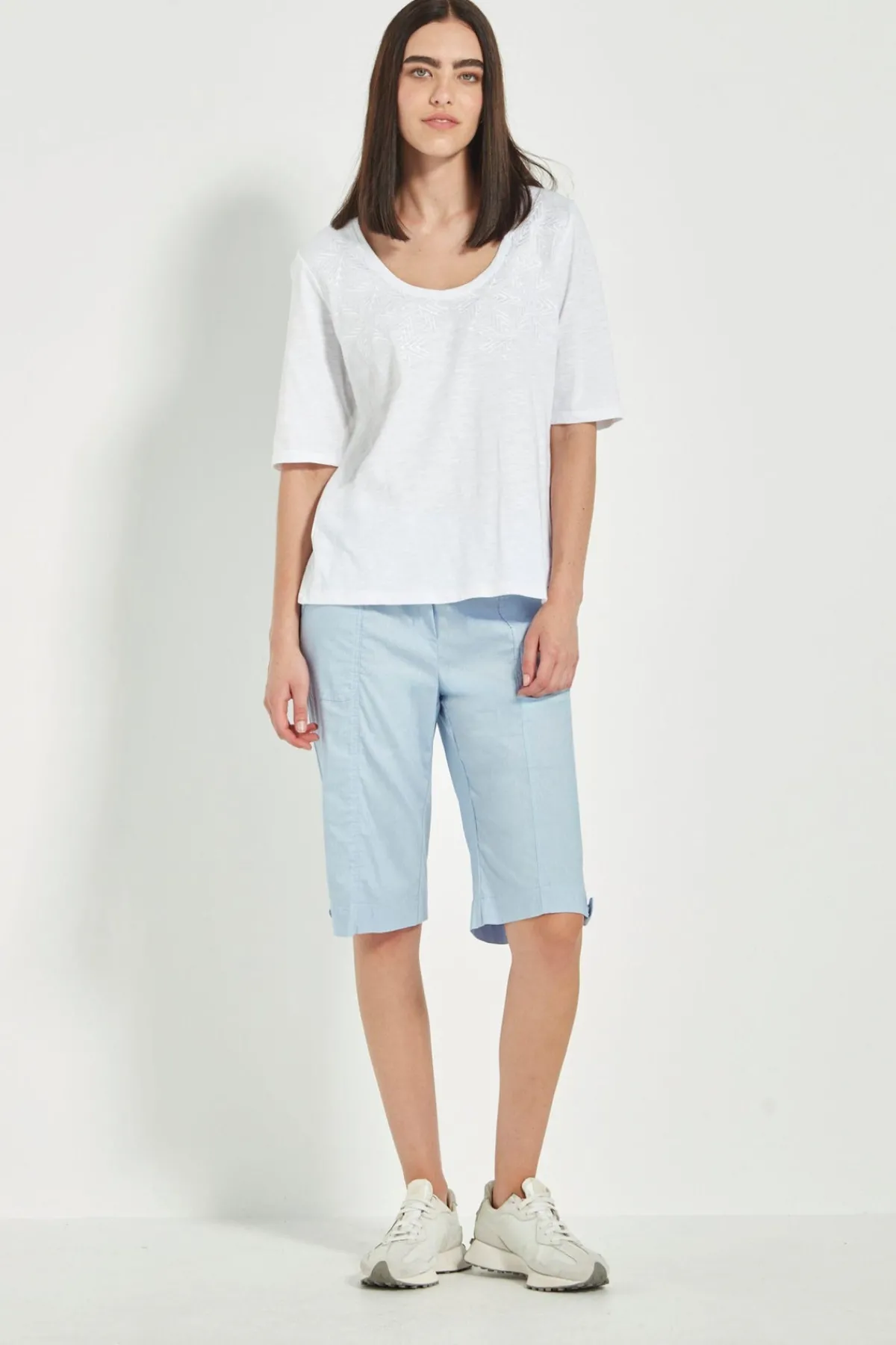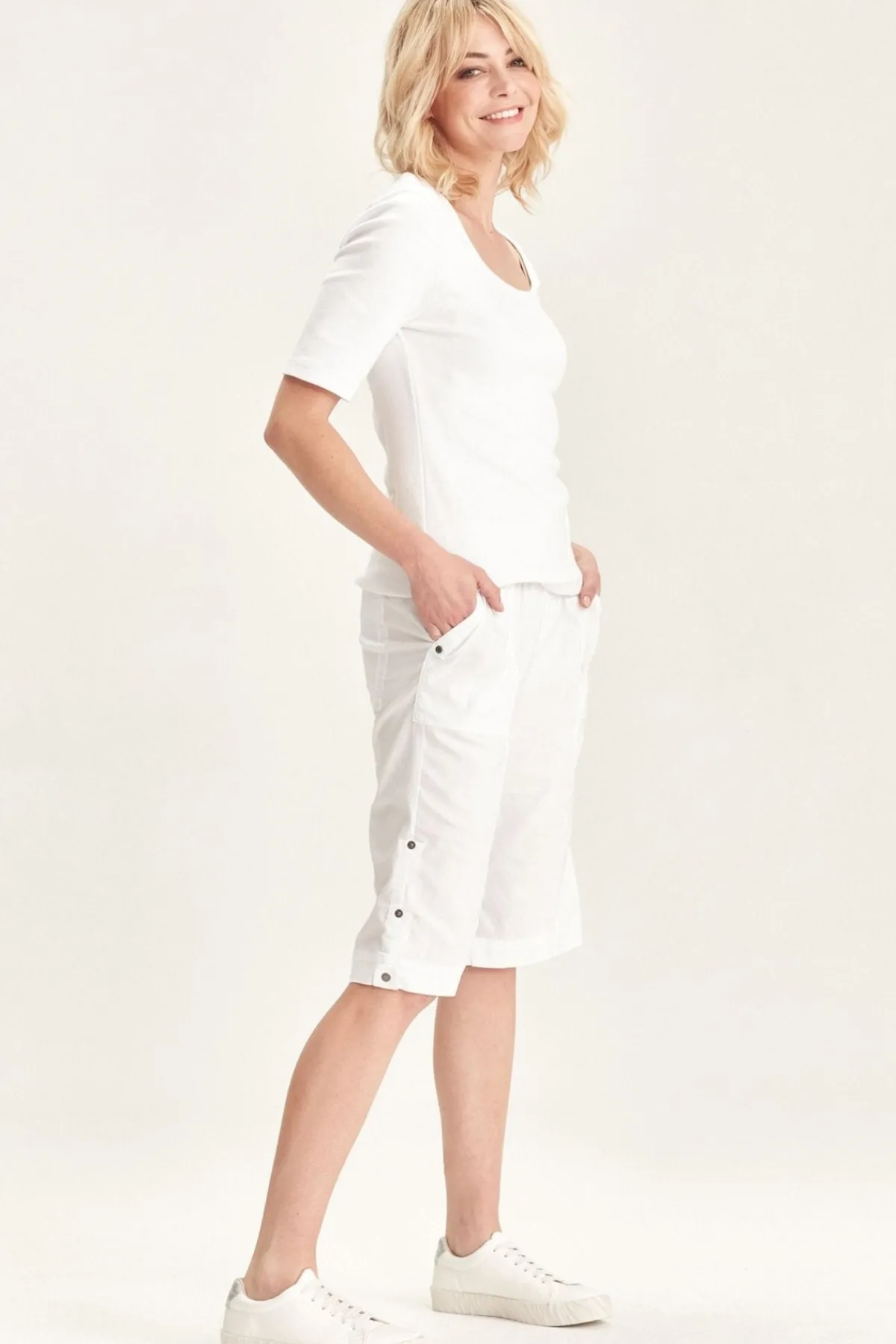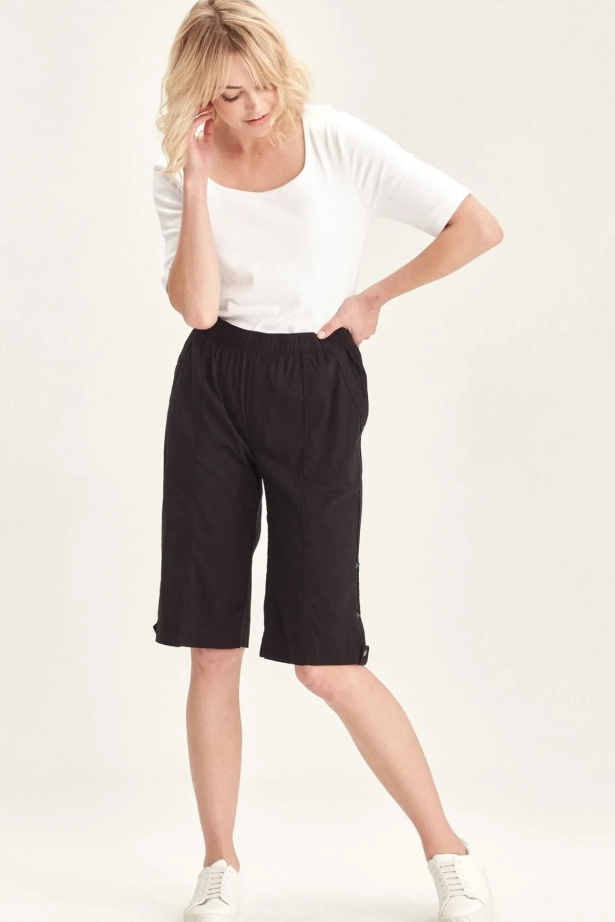 Knee length Acrobat stretch short features an easy wearing elasticated waist, patch pockets with rivet details on front and back with tabs at side to roll up hem. A classic short for every wardrobe.