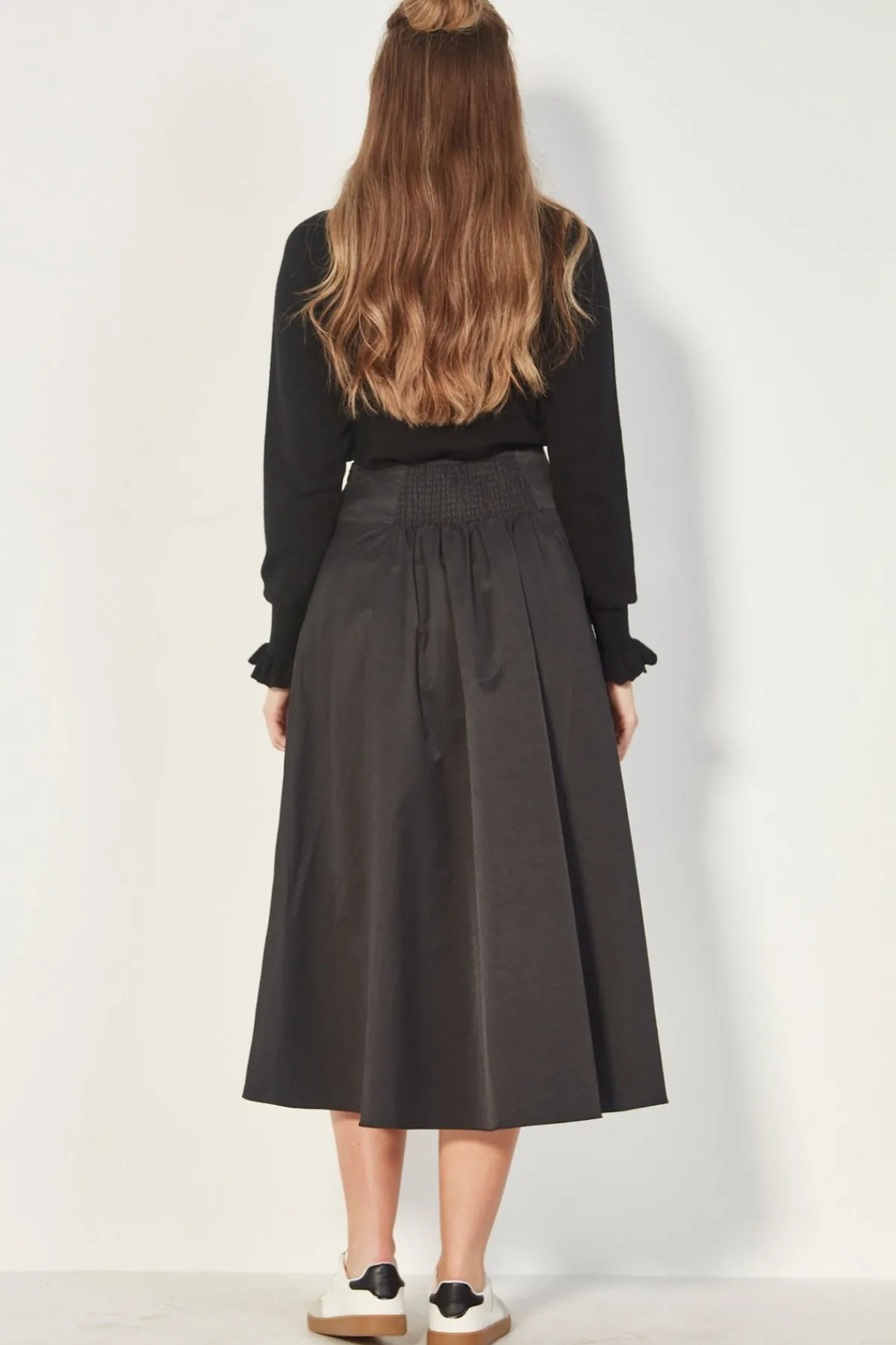 Expertly crafted from high quality Cotton blend twill our Stroll skirt in classic black features a flattering A-line silhouette and a high waisted design. The pleat detail on the side of the hip adds a touch of sophistication while the full skirt ensures comfort and style. Elevate your wardrobe with this must-have piece. A Line shape. High waisted. Shirred back waist detail. Full skirt. Falls to mid calf.