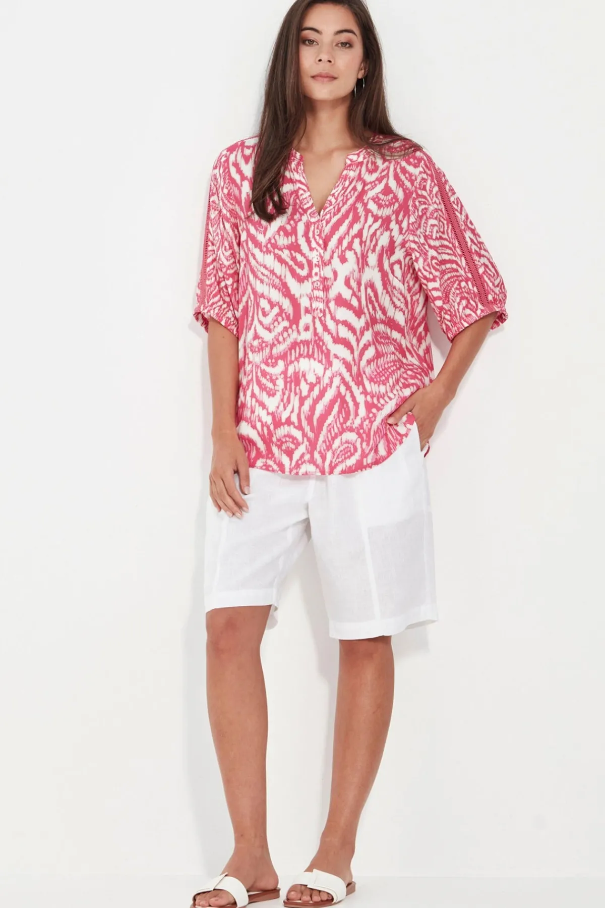 The Vale Top features a structured half placket with a V neckline for a clean, modern finish. Lace insert detailing runs through the shoulder and down the length of the sleeve, adding a feminine touch. The sleeve gathers into a soft elastic cuff for ease and comfort. Crafted from soft-touch rayon, it skims the hip with a curved hem, an effortless piece to dress up or down.