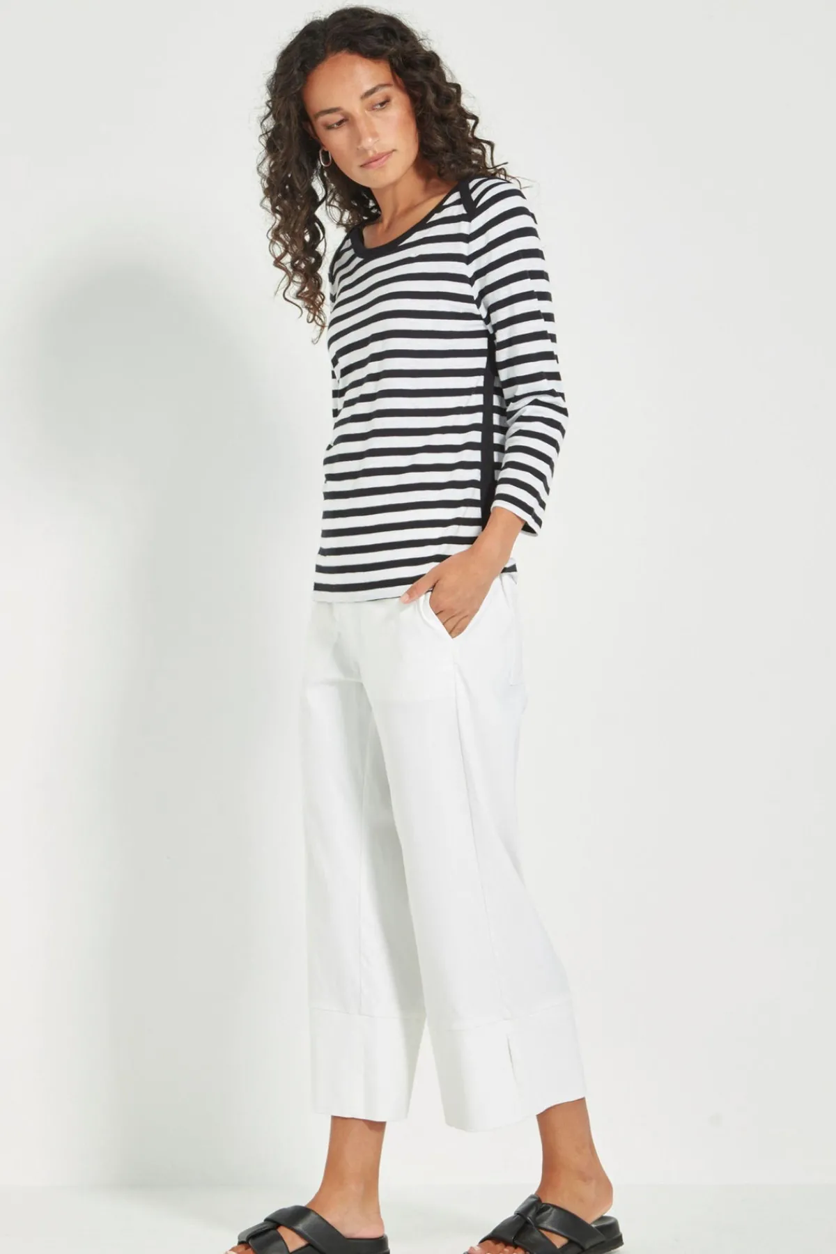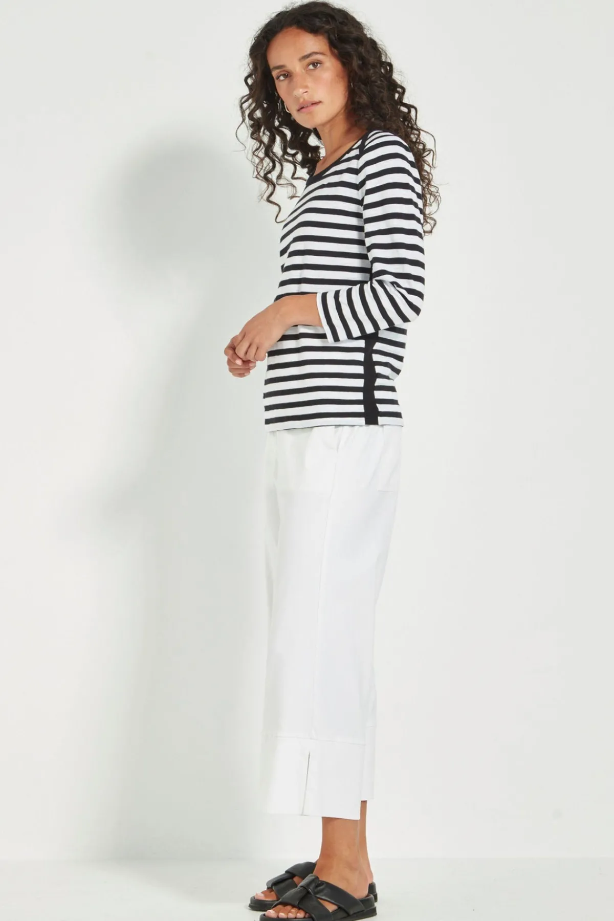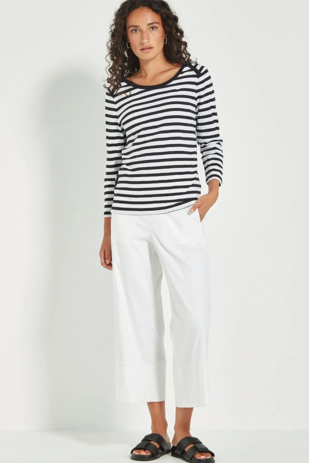 The Horizon top is a sophisticated and modern addition to any wardrobe. Made from a comfortable and soft Stripe 100% Cotton, it features a unique angled stripe detail on the shoulders and a flattering rounded neckline. With elevated tape trim detail on the neckline, shoulder and each side of the top for interest. The full length sleeves and hip-length hem make it versatile for any occasion.