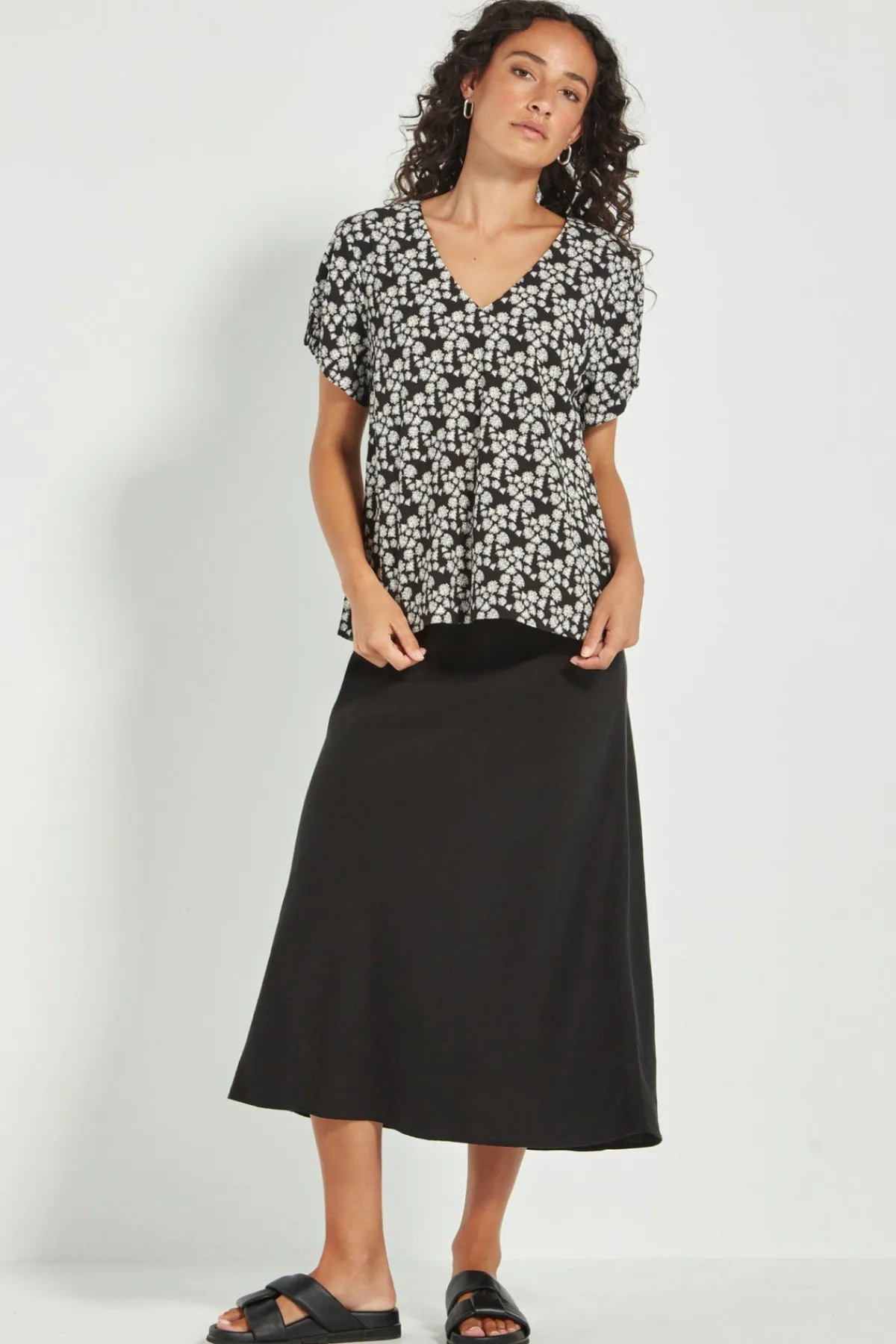 The Pixie Top features a delicate black and white ditzy print with a subtle hint of green. Designed with a smaller frame, it offers a flattering V-neck and set-in sleeves with elasticated hems. Details include side splits and a back tab secured with a self-covered button. Made from stretch fabric, it’s an easy, stylish choice for everyday wear—perfect to pair with pants or skirts, skimming the hip for a flattering fit.