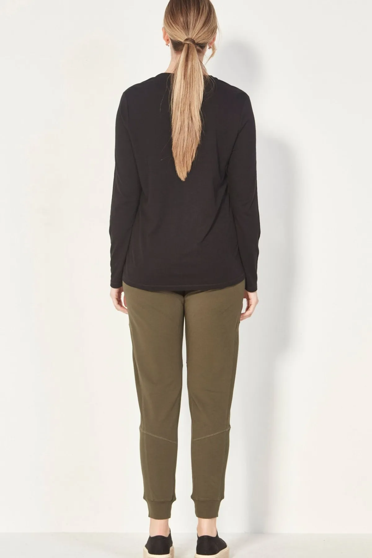 Cotton/Modal top with rounded neckline and feature print with hotfix detail on front. Fit and flare shaped top. Bracelet length sleeve. The Joss top falls just below the hip.