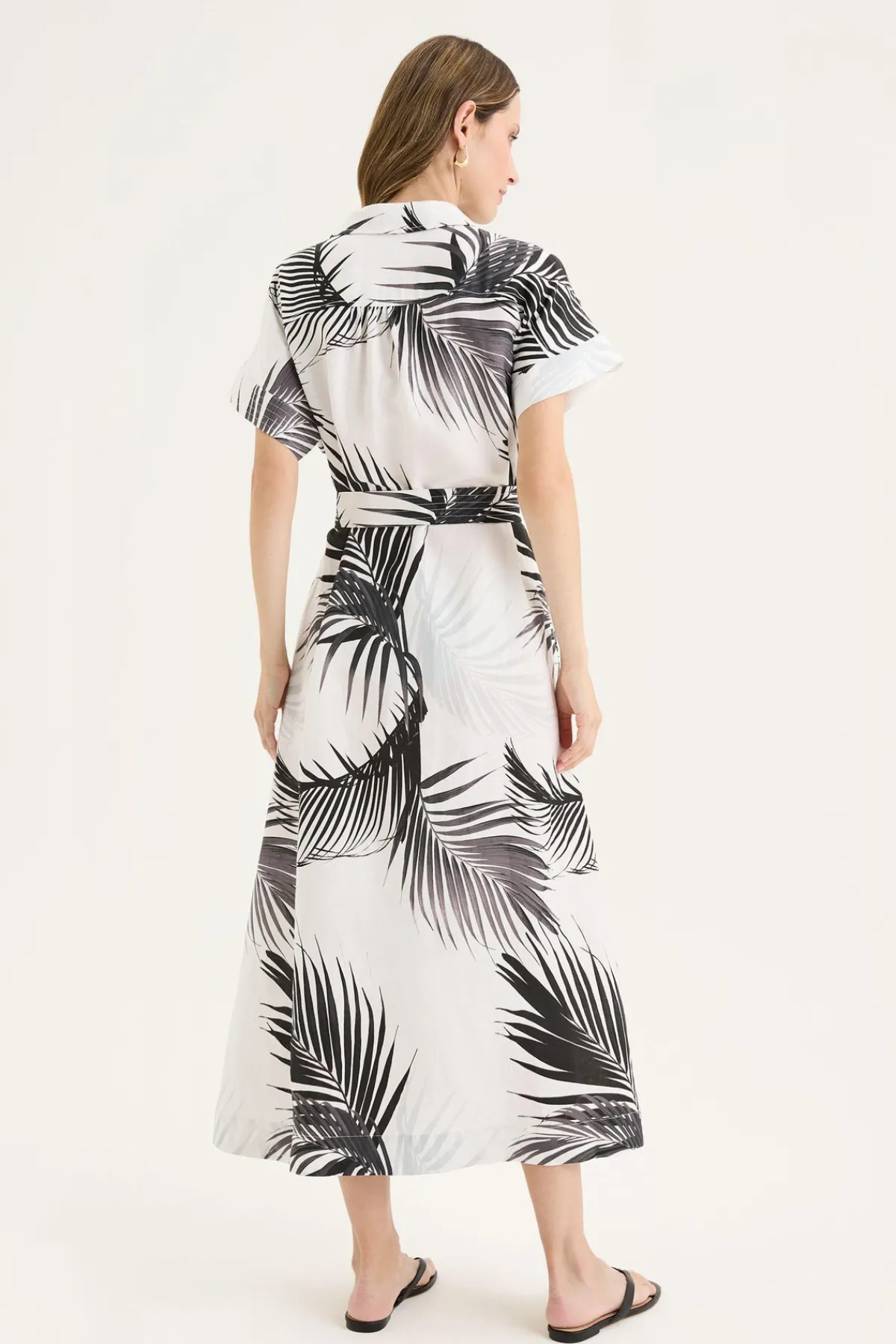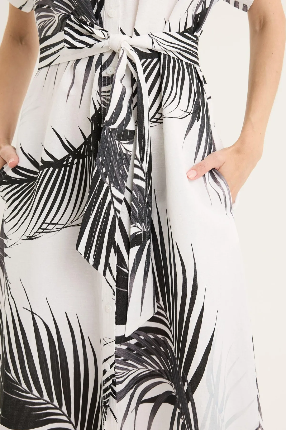 Embrace elegance in this black and white palm frond print dress, designed to elevate your summer wardrobe. Its refined pattern and flattering silhouette make it an ideal choice for any sophisticated event, offering both comfort and timeless style. Perfect for warm days, this dress combines effortless charm with a modern touch.