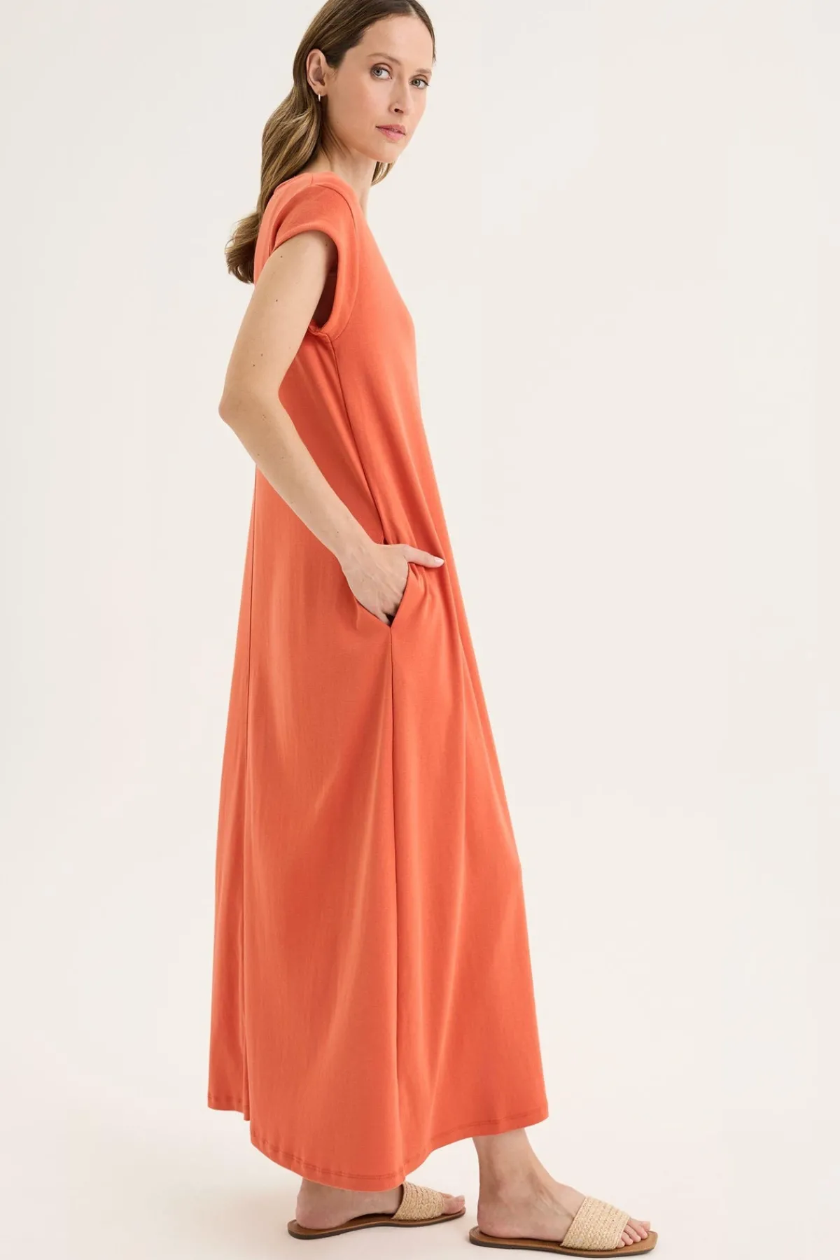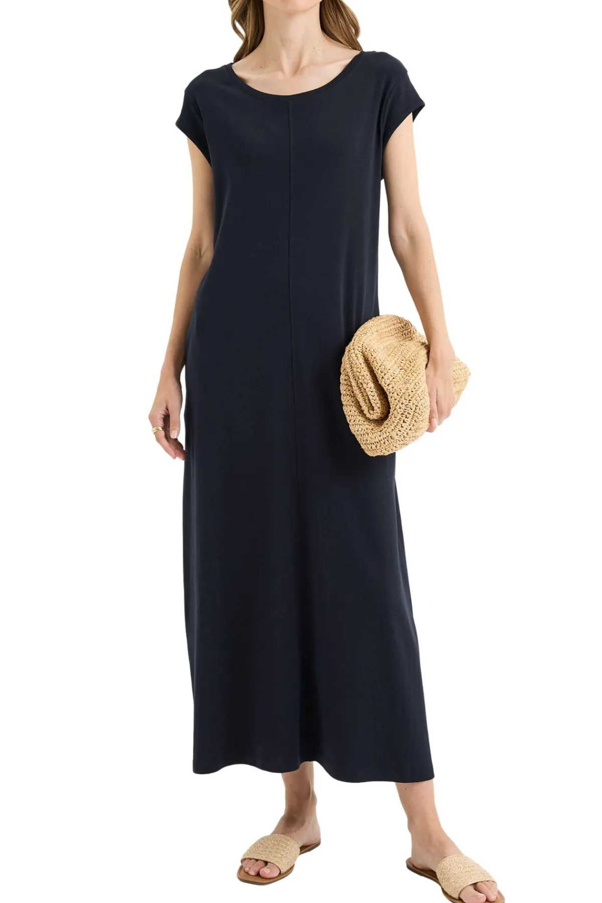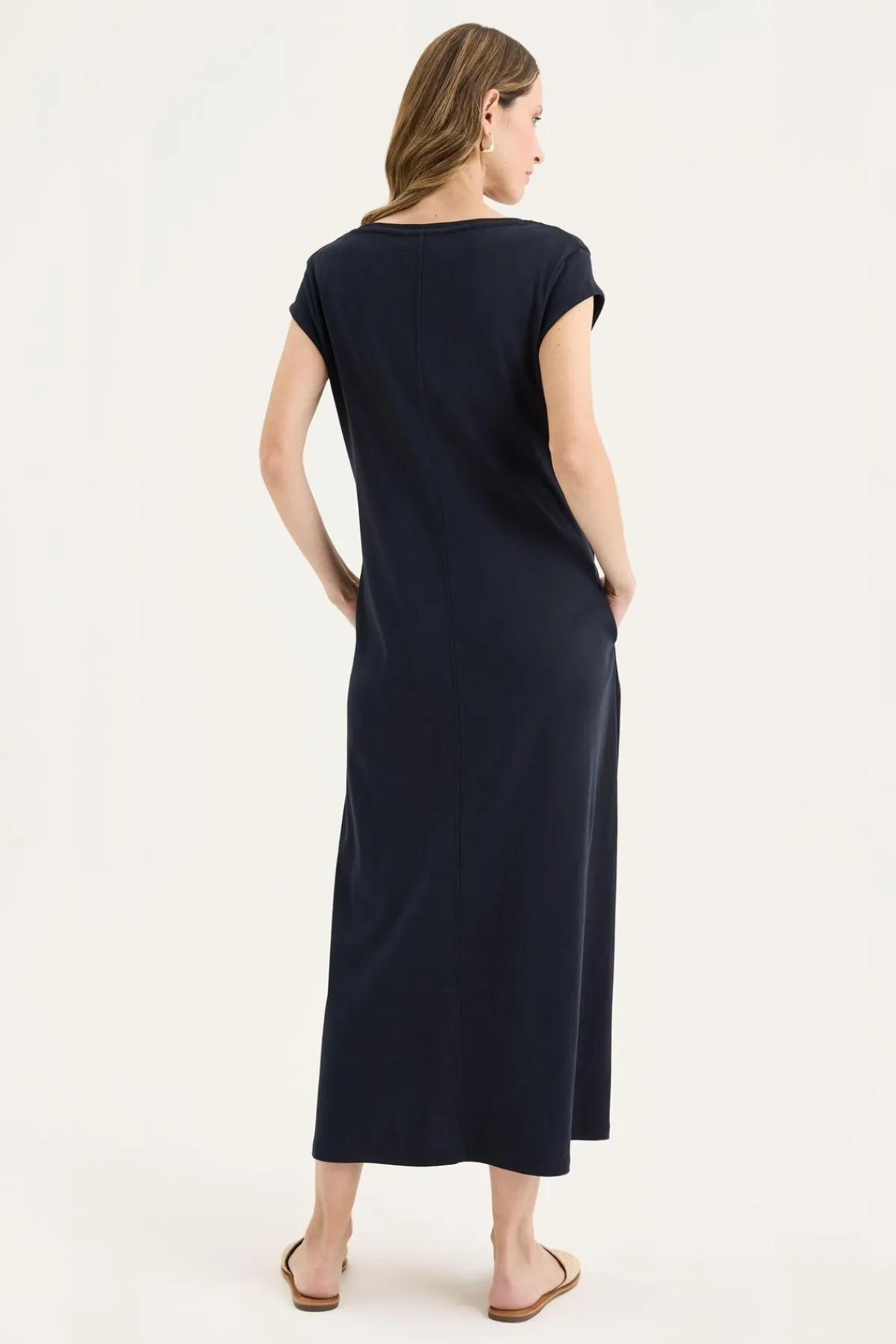 The Solitude Dress is a true cotton maxi, designed for comfort and versatility through the warmest months. Crafted from 100% breathable cotton, it features a round neckline, cap sleeves with stitching, and a clean centre-front seam that gives subtle structure without compromising its easy drape. The ankle-length A-line silhouette offers generous movement, while functional inseam pockets add everyday practicality. With its loose, unstructured fit, this maxi dress can be worn effortlessly over swimwear for a day at the beach or styled with sandals and jewellery for an elevated summer look.