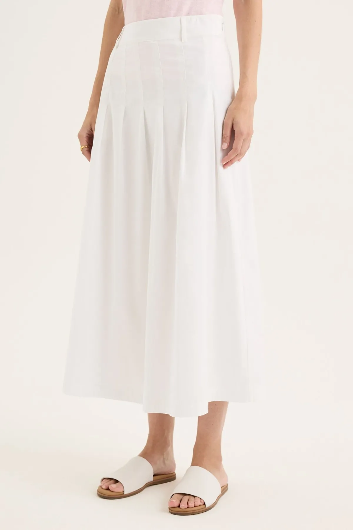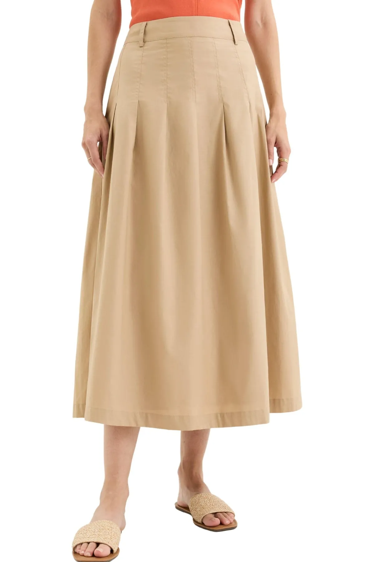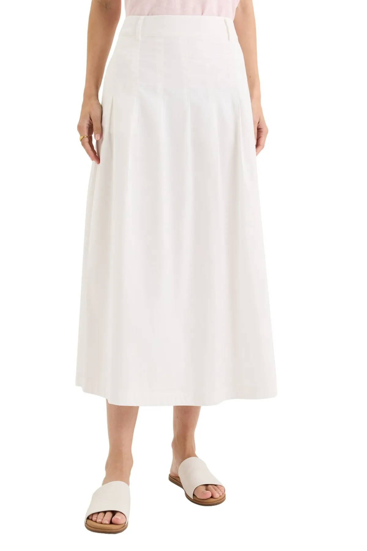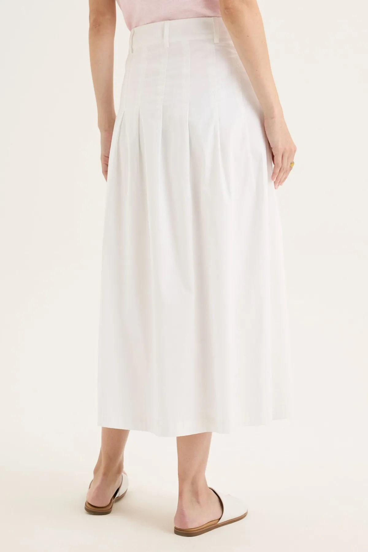 The Petal Skirt is a refined take on everyday femininity, combining soft structure with thoughtful detail. Cut in a flattering A-line silhouette, this midi-length skirt features front and back pintucks that add gentle dimension, enhancing its graceful shape. A fixed waistband with belt loops offers a tailored finish and styling versatility, while the invisible side zip keeps the look clean. Crafted from a breathable cotton blend with a touch of stretch, it moves with ease and comfort. Falling to the calf, this is a beautifully made skirt with a timeless feel – easy to dress up or down, and a quiet blend of pretty and utility for any wardrobe