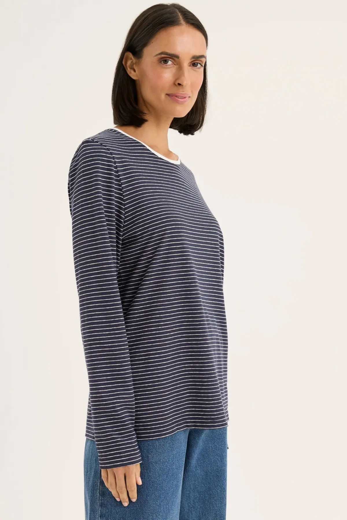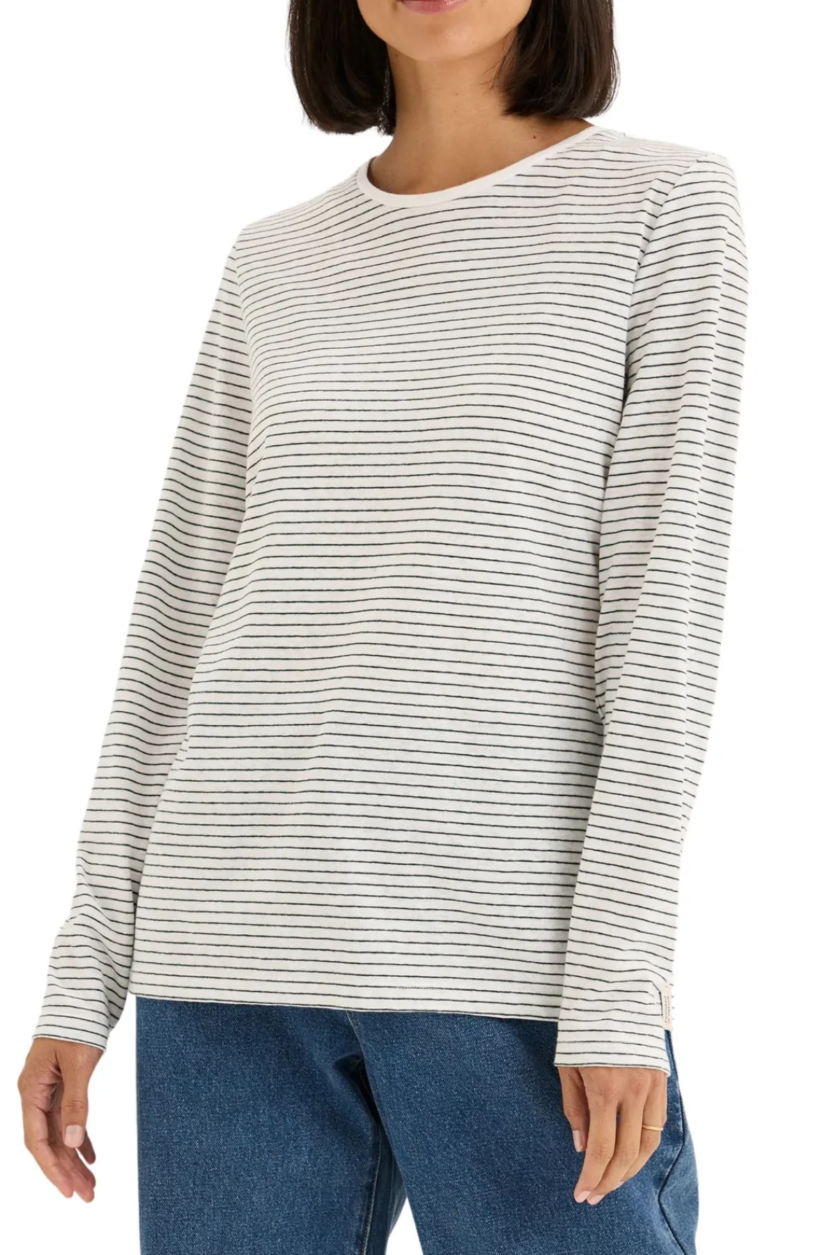 Made from quality fabric blends of Linen and Cotton, the Mirage Tee offers a dressier essential rather than a classic one with its adorned slender stripes. Finishing around hip length in a regular fit, it also features a round neckline and long sleeves that ensure sleek and timeless aesthetic. Effortlessly paired with any anything in your wardrobe this tee will be on constant repeat throughout seasons.