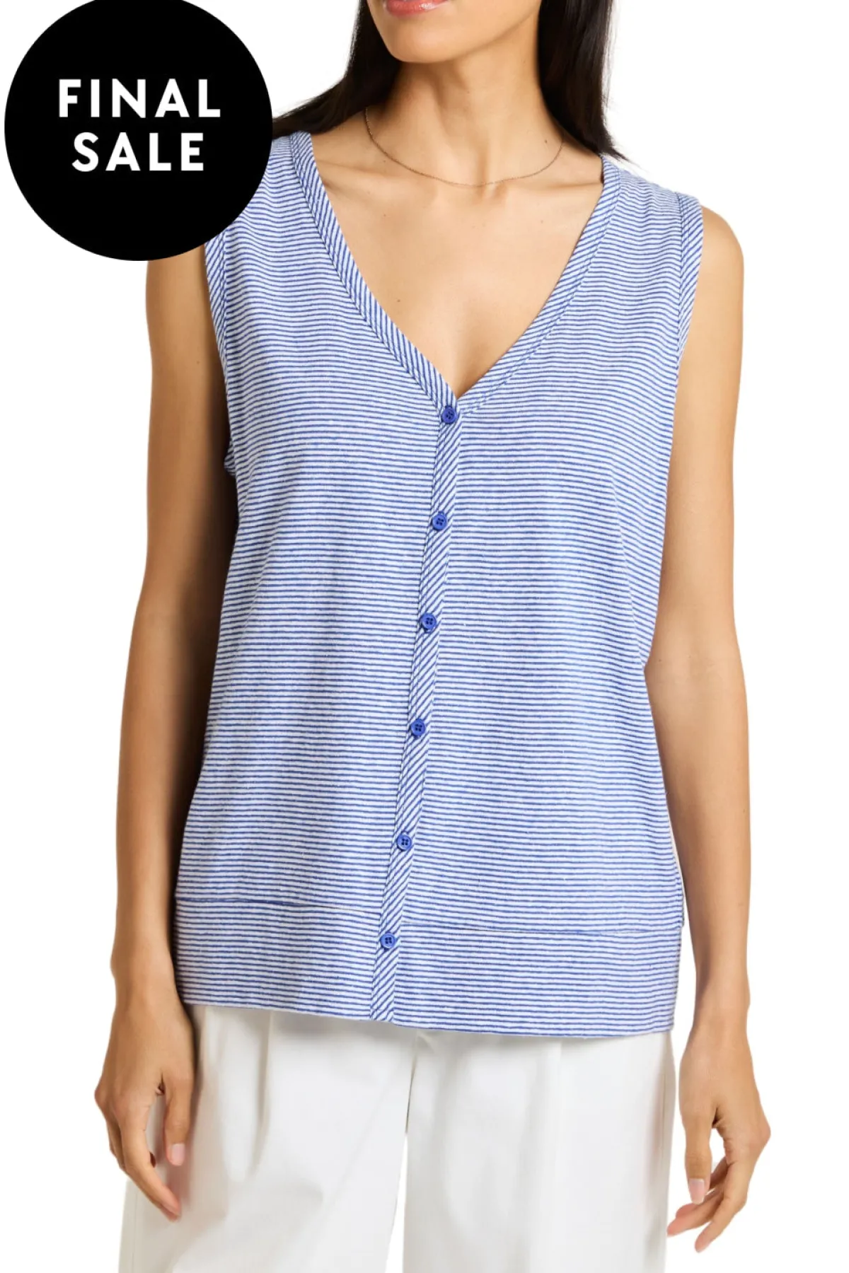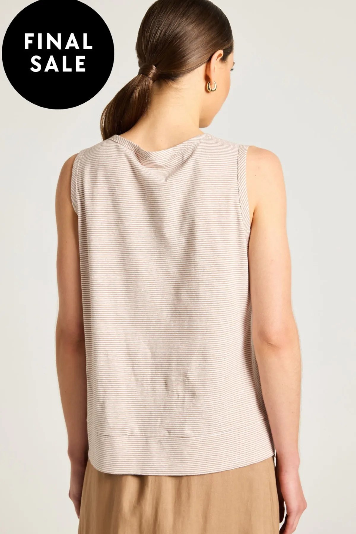 Inviting summer fun and freedom, the Dahlia tank offers them both in exclusive designer stripes, from slub jersey fabric. The banded V neckline and banded armholes are finely and quality-finished. Style it relaxed or tuck it into a denim skirt for a chic ensemble.