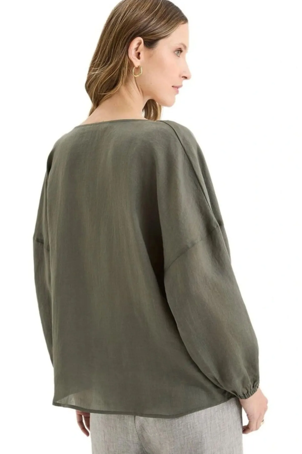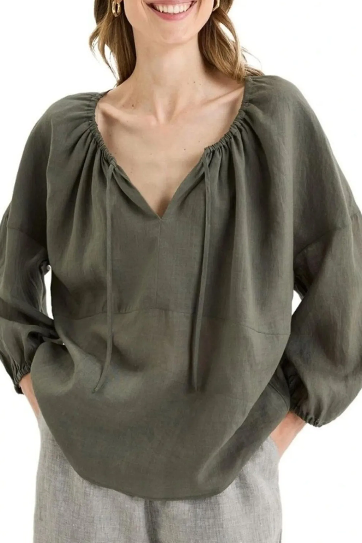The Bohdi Top blends soft, bohemian-inspired flow with classic Yarra Trail detail. Crafted from a lustrous ramie-tencel blend, it drapes beautifully and moves with ease, offering a lightweight linen-like texture. The cut-away round neckline can be styled two ways – worn open for a relaxed V-neck effect, or drawn in with the encased drawstring for a softly gathered, rounded shape. Featuring a double-layered front yoke for structure, drop-shoulder sleeves with elastic cuffs for volume, and a high-low hem to enhance the flattering silhouette, it’s a versatile piece that is equally suited to casual days or elevated layering.