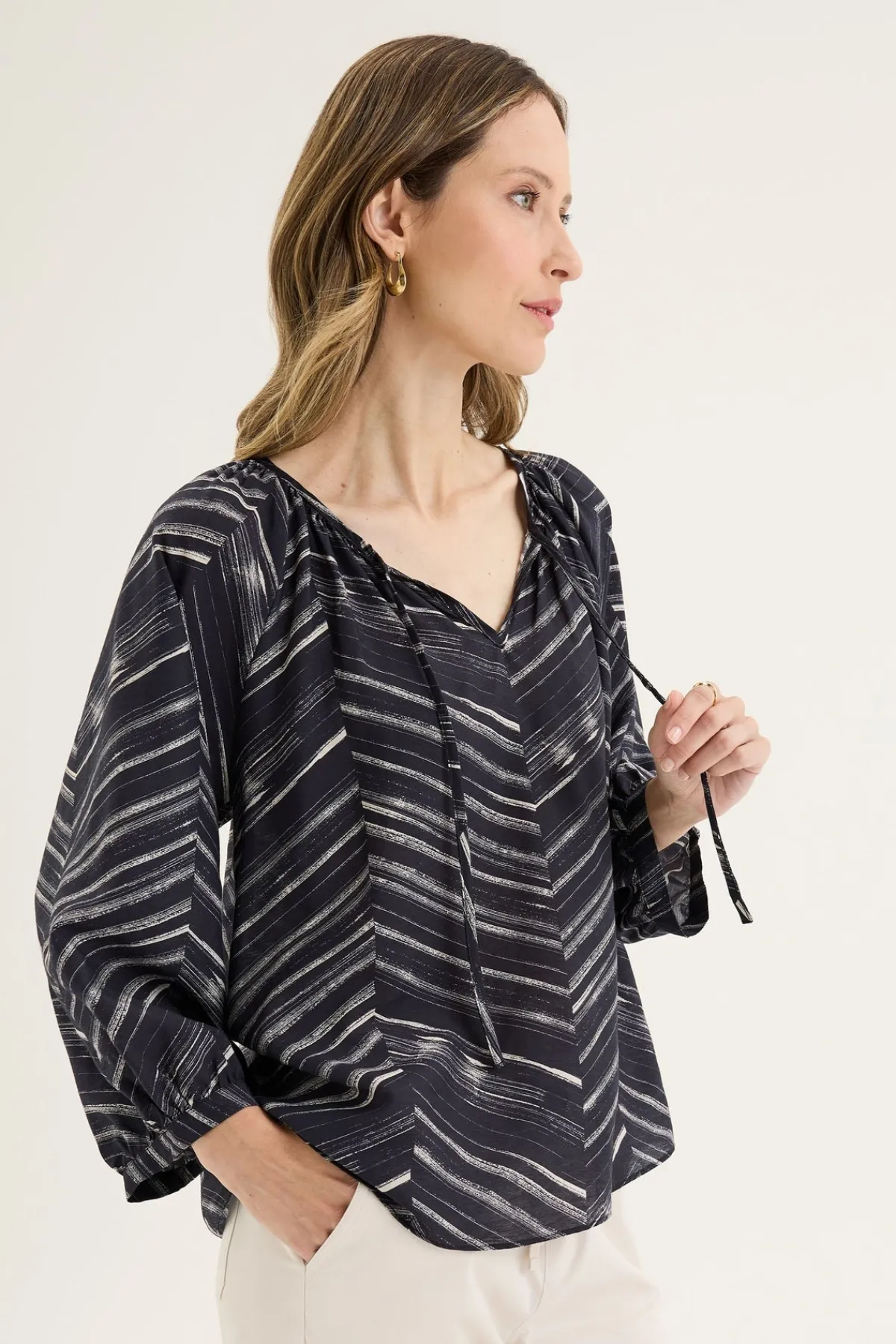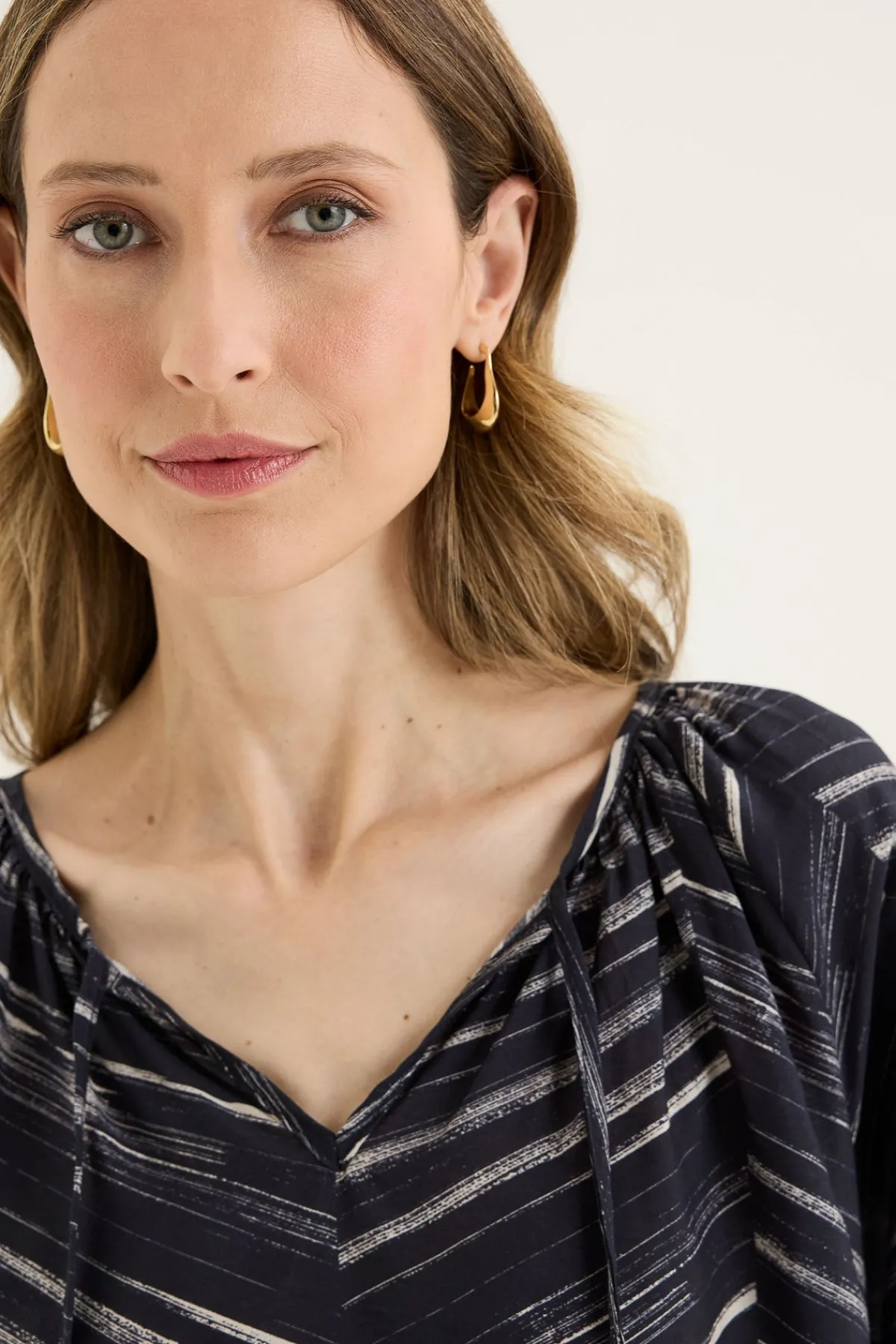 The Fleeting Top captures movement and lightness in every detail. Designed with an angular painterly stripe print exclusive to Yarra Trail, it drapes in a relaxed silhouette that feels effortless to wear. The round neckline features a cut-away front with delicate drawstring ties that can be worn open for a casual V-neck look, or tied for a more gathered shape. Semi-gathered raglan sleeves finish at a breezy three-quarter length, adding soft volume and flow. Wispy, weightless, and quietly striking, it’s a blouse that brings softness and artistry to everyday dressing.