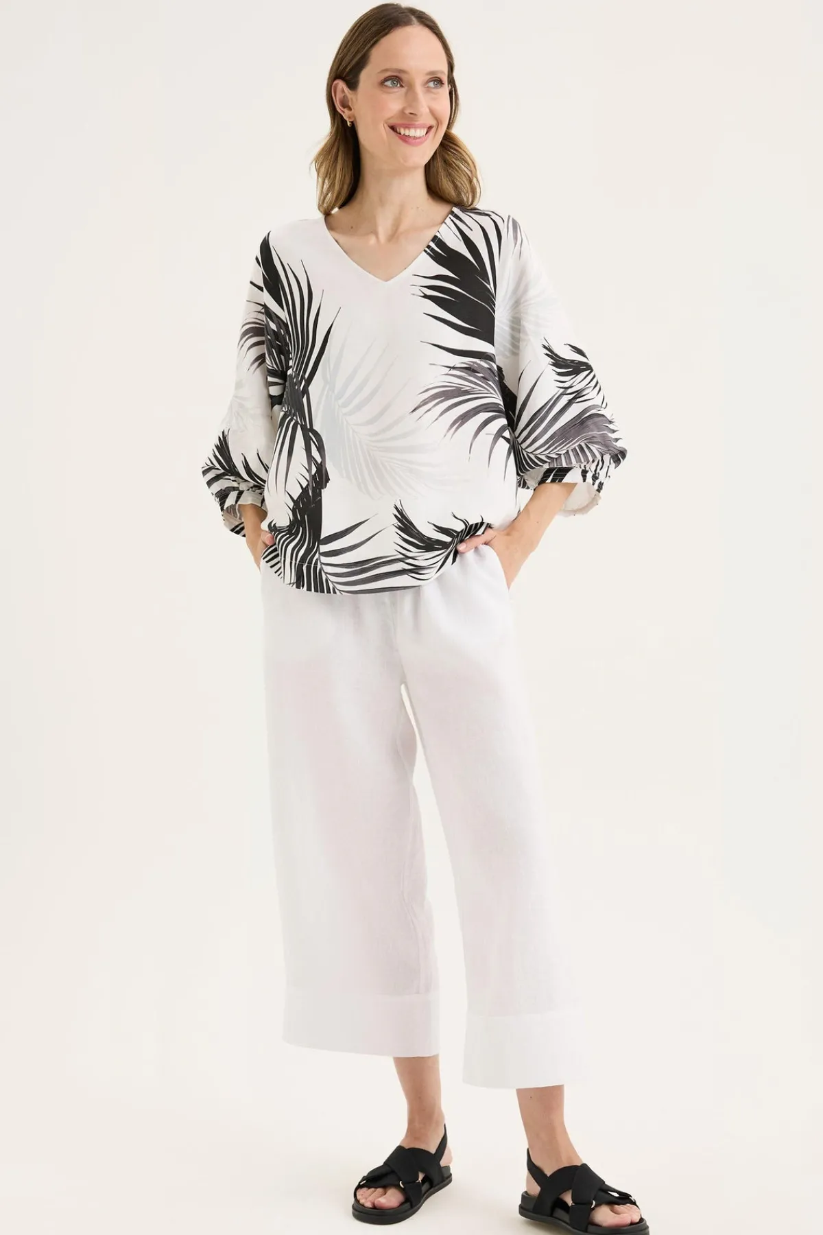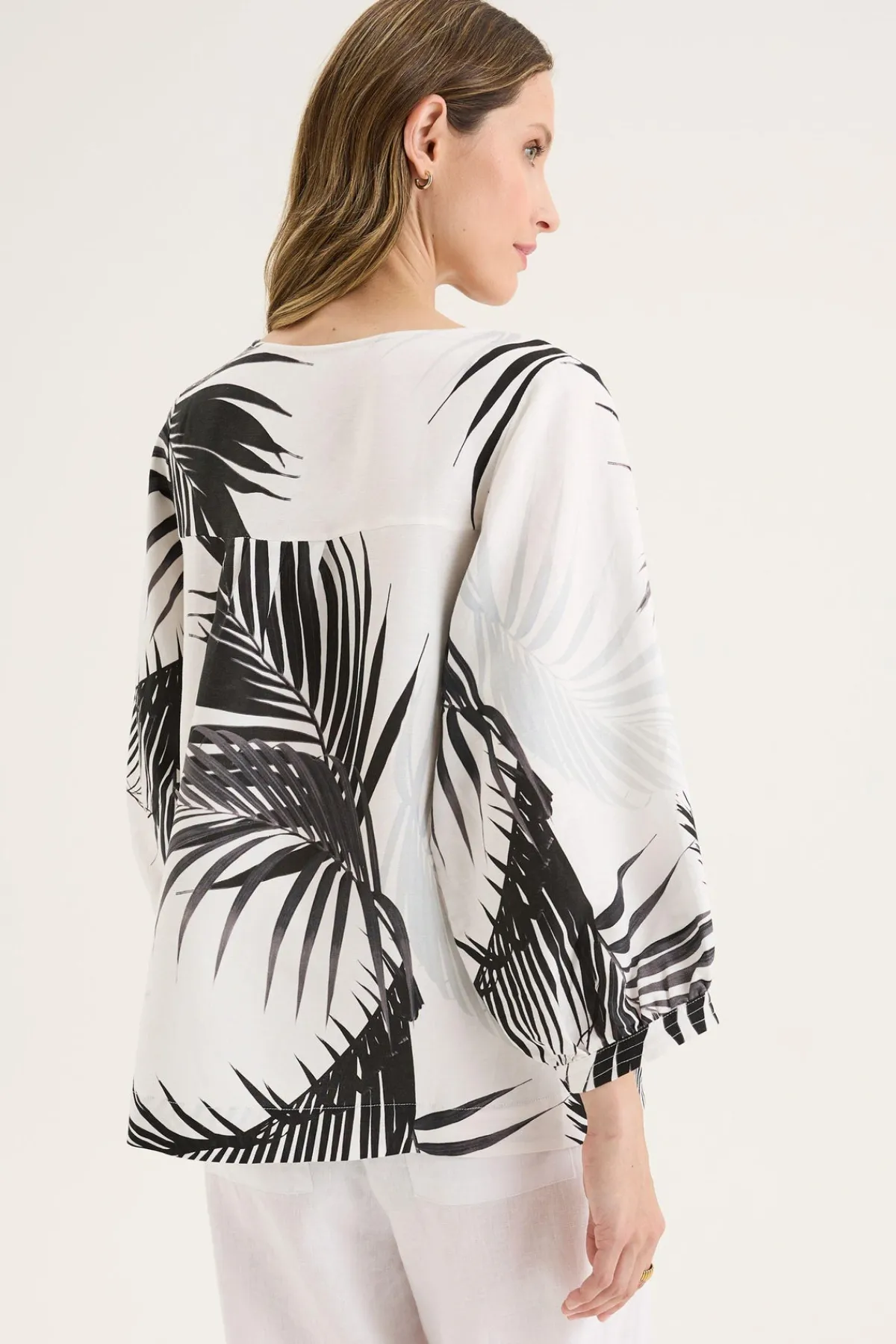Elevate your wardrobe with the FROND TOP, featuring a striking black and white palm frond print on a cool linen blend fabric. This top offers breathable comfort and a refined silhouette, making it an ideal match for white wide-leg pants. Perfect for a polished, sophisticated look that transitions effortlessly from day to evening.
