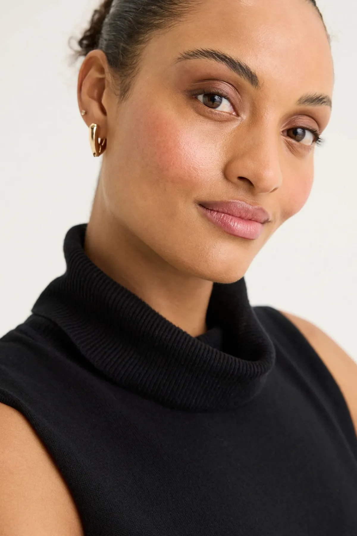 - High, ribbed, rolled neckline