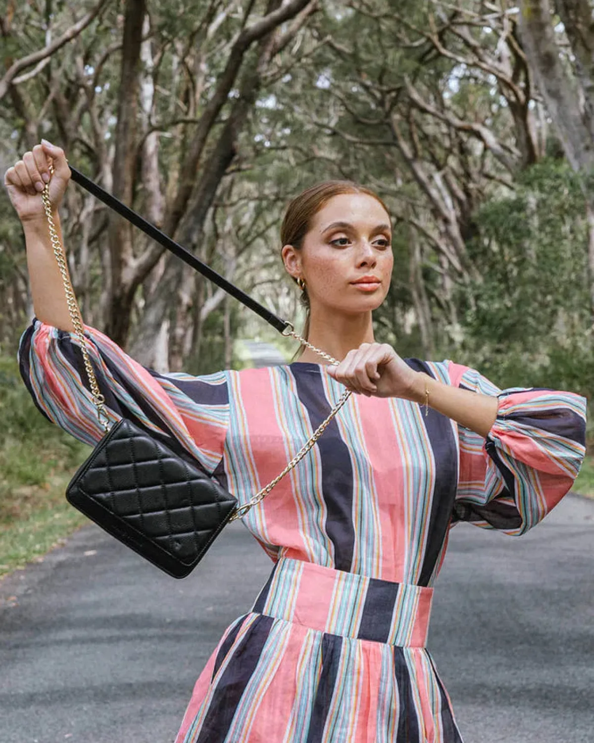 The Arlington Milne Sarah Crossbody in Black is crafted from premium leather and features a quilt stitch detail. Sarah can be carried clutch style or worn using the long shoulder strap. The envelope style top flap opens to reveal Arlington Milnes signature hot pink lining and an open top slip pocket with leather trim.