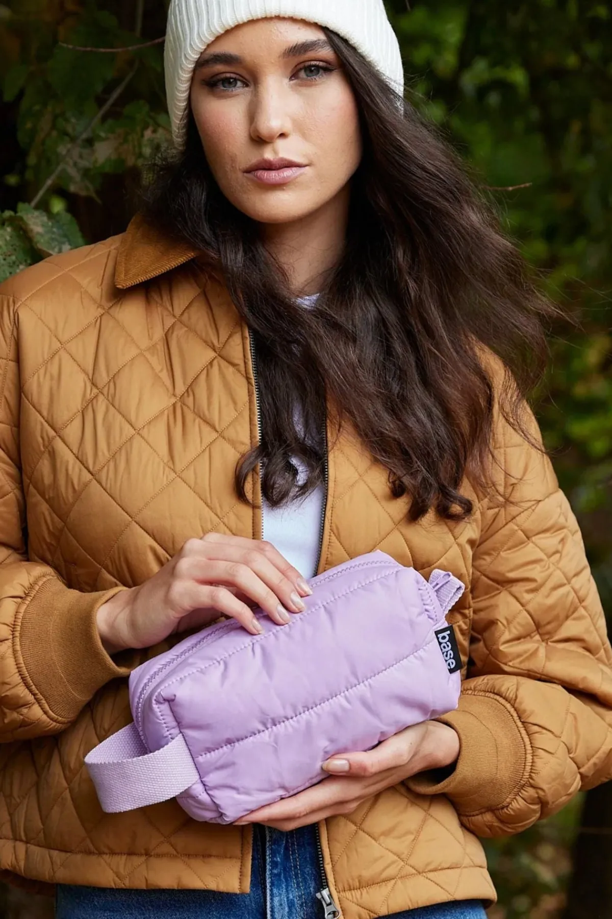 - Soft polyester fabric outer shell and lining. Faux down fill. 100% cotton carry loop