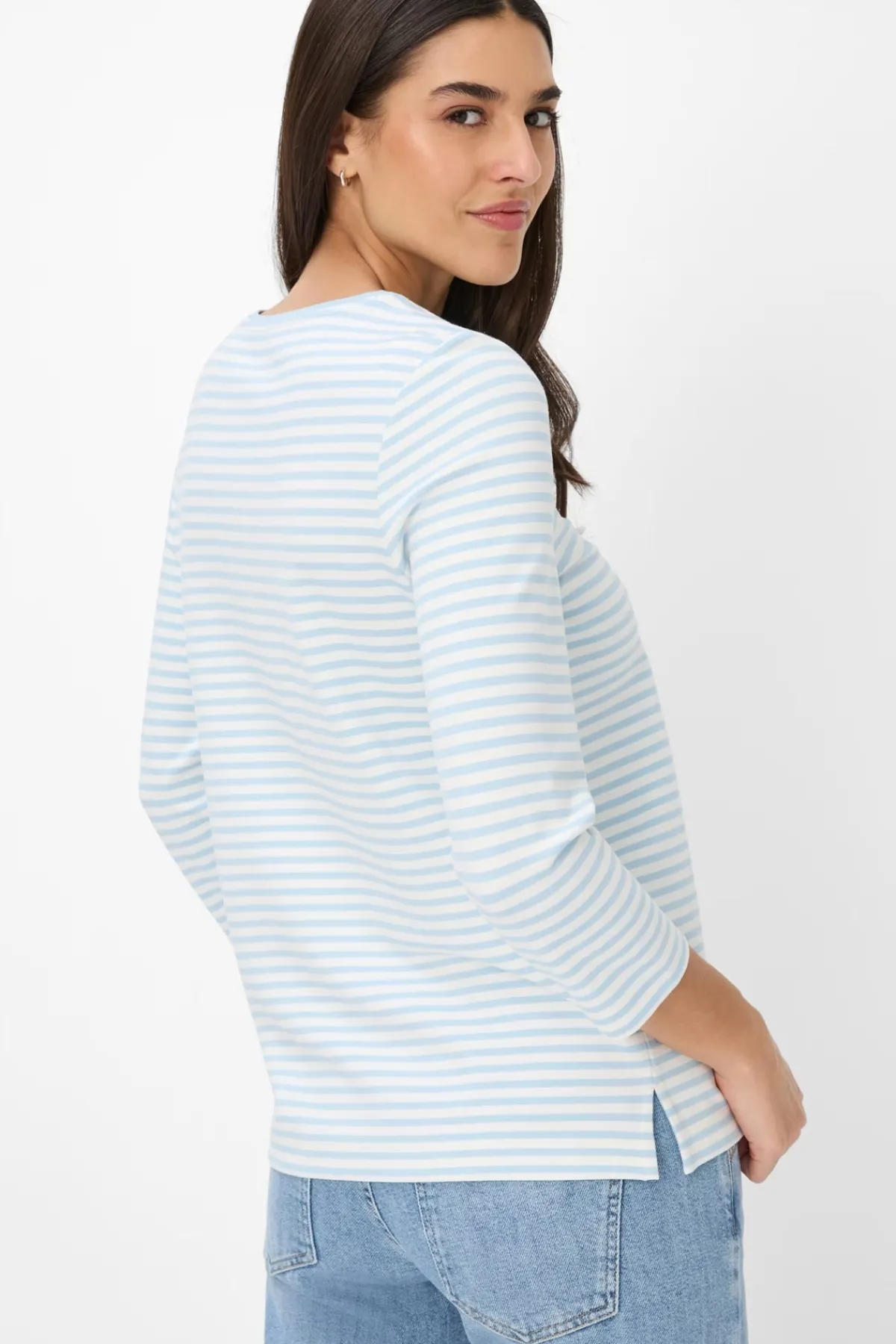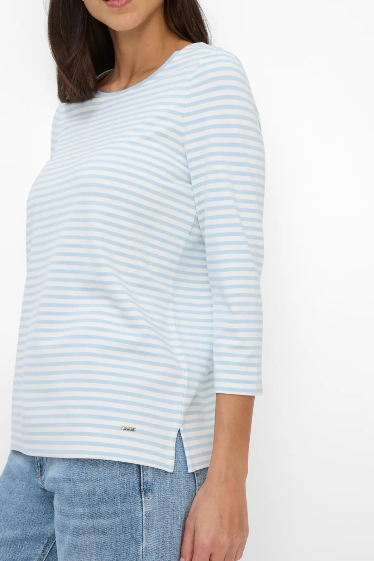 The Bonnie Tee features a round neckline and 3/4 sleeves with fine stripes for a fresh, sporty look. Made from soft, stretchy fabric, it offers comfort, durability, and easy care—ideal for everyday wear.