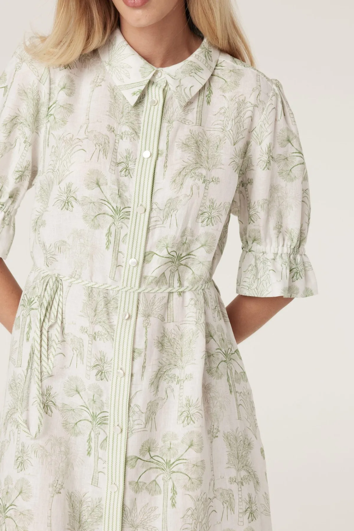 Made from pure French linen, the Avondale Linen Dress features a regular fit with a classic shirt collar and a button-through front. It includes sleeves with elasticated cuffs, side pockets, and a removable waist tie for adjustable styling.