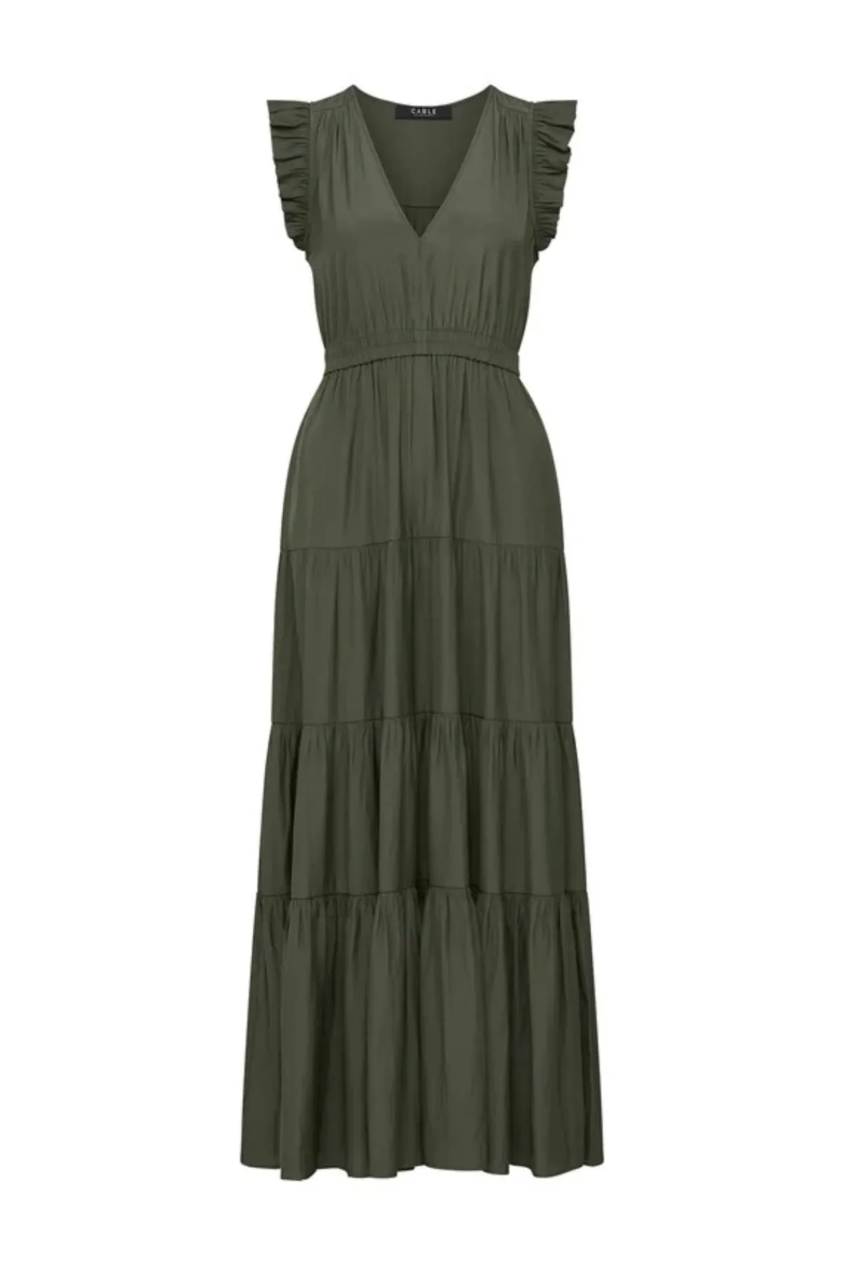 The Kahlo Maxi Dress offers a regular fit and maxi length, designed for elegance and comfort. It features a V-neck, a fully elasticated waist, side pockets, and a tiered skirt that enhances its flowing silhouette.