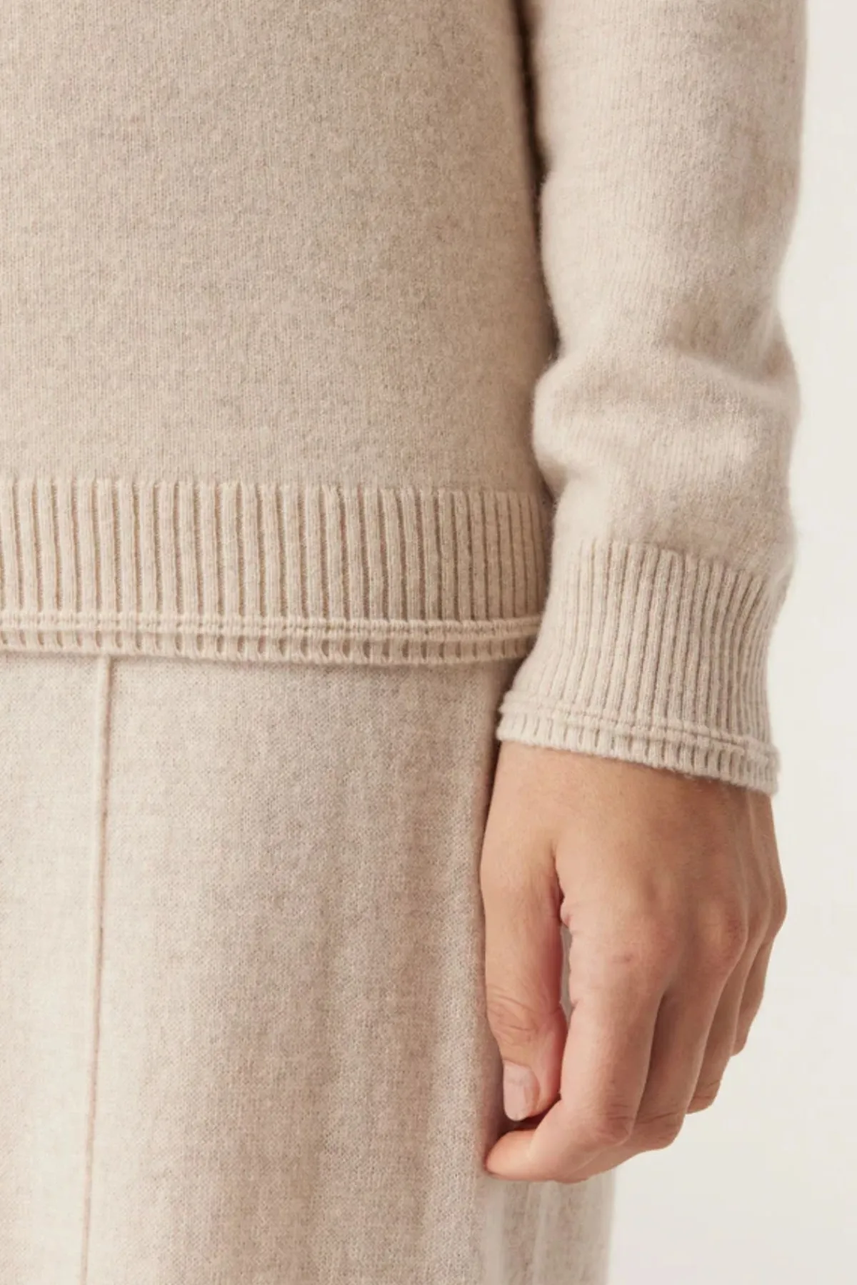 - Rib and welt trim detail at neck, cuffs and hem