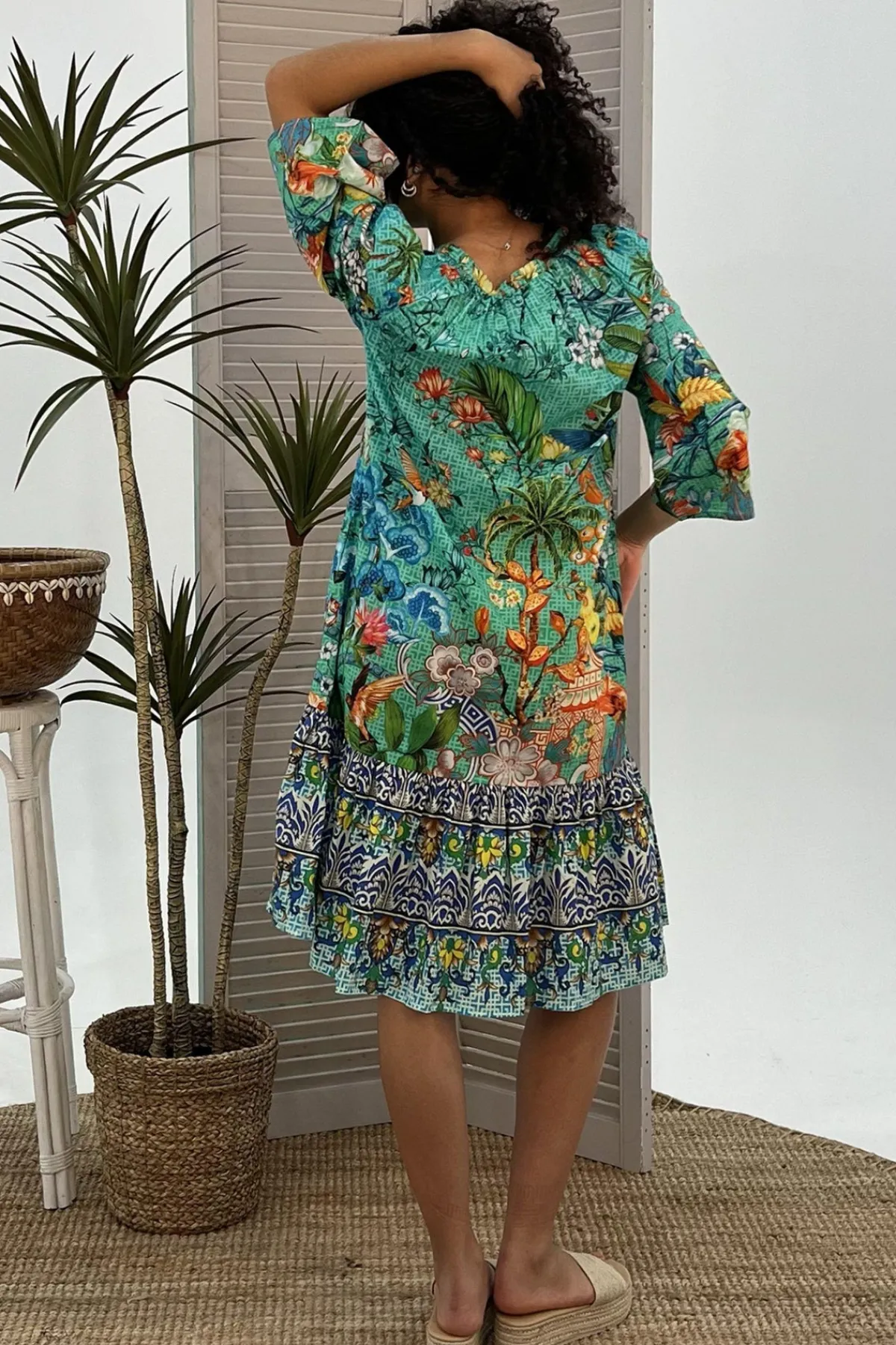 Introducing your new favourite dress! This midi length beauty has wide 3/4 sleeves, tassels at the neckline, and pockets on the side seams. The V-neckline adds a touch of elegance while the 100% cotton fabric offers comfort and breathability.