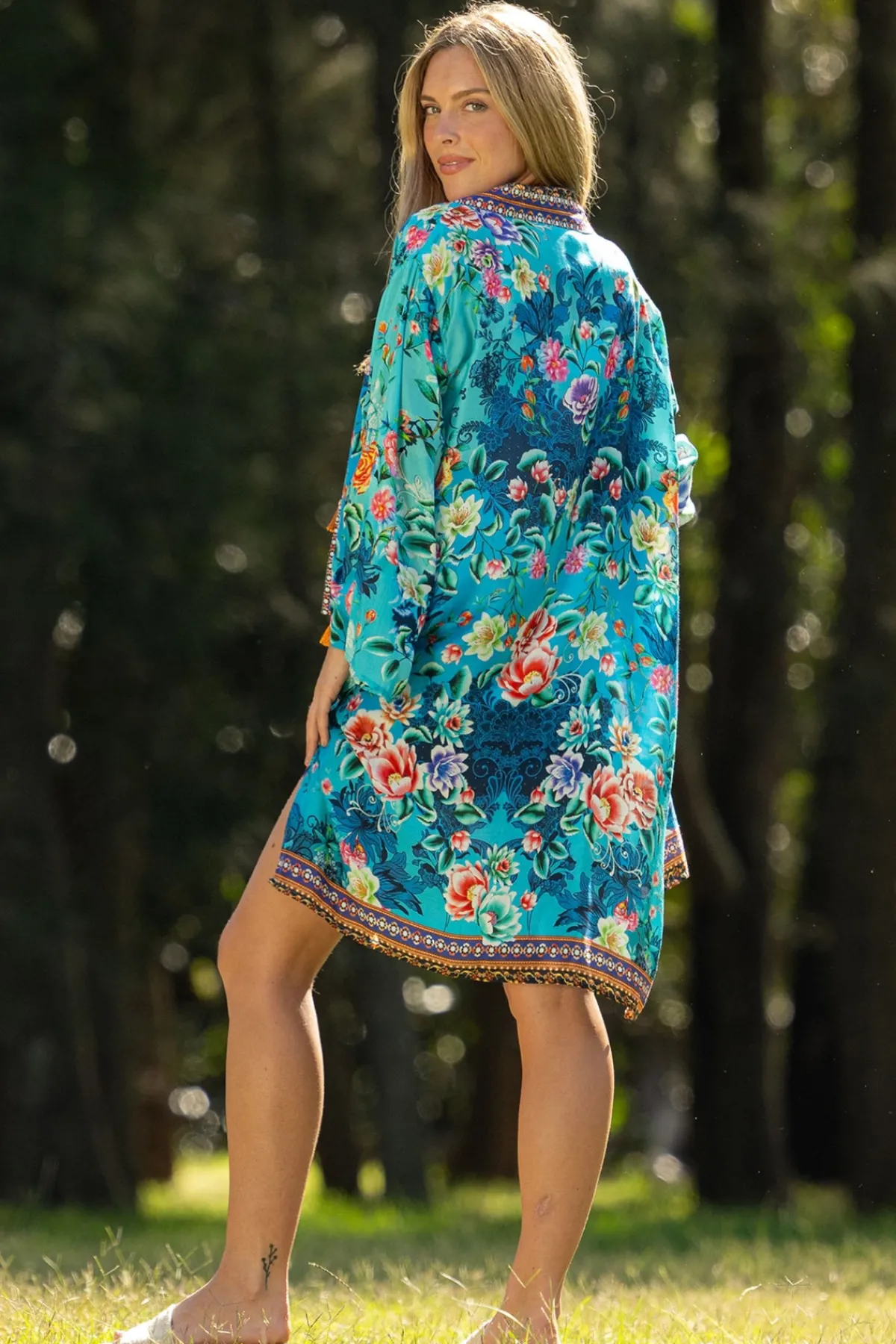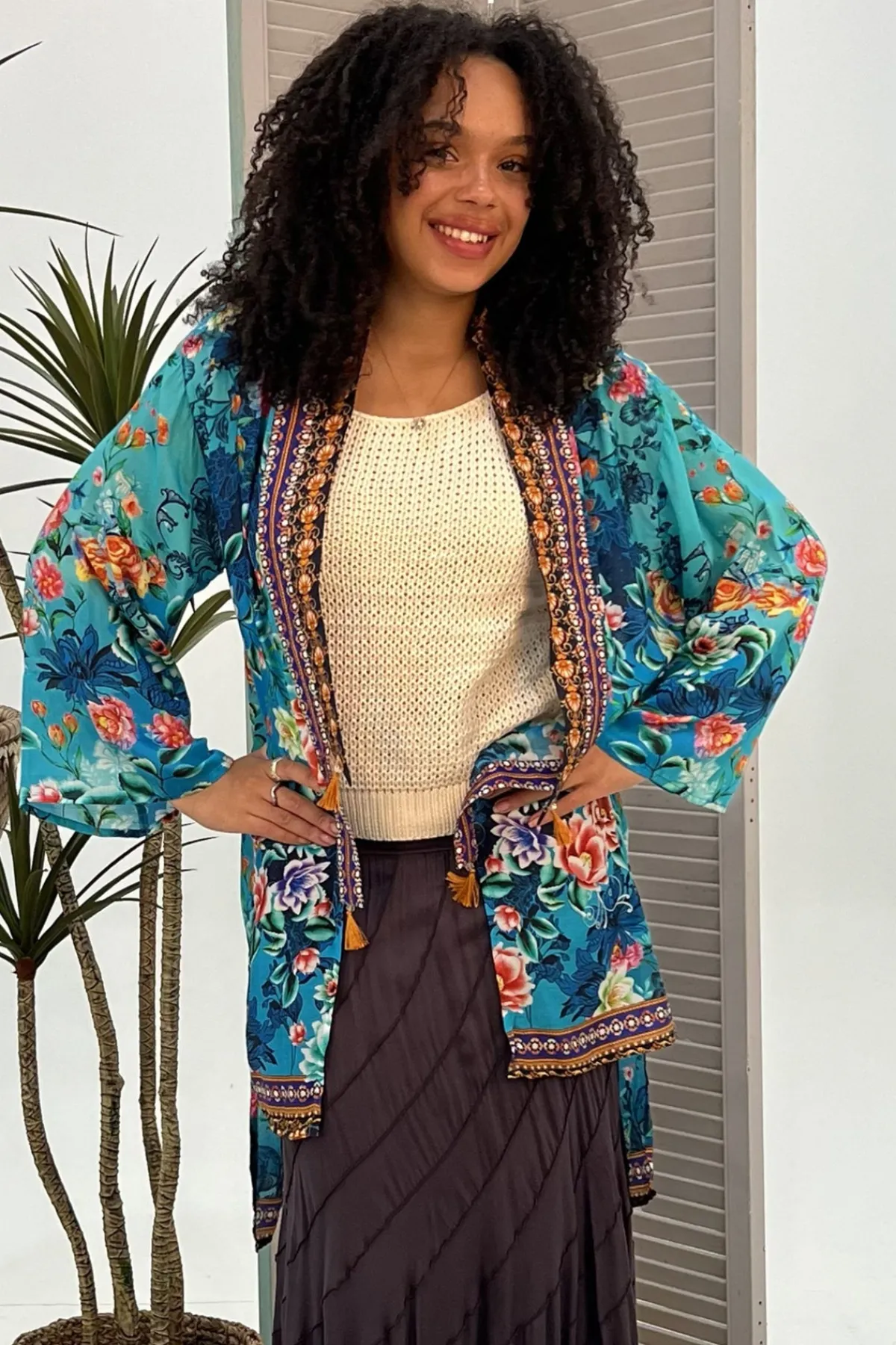 This vibrant Tropical Kimono features silky fabric adorned with a playful floral digital print in beautiful aqua hues. Finished with delicate silk beaded tassels at the edges, it’s a fun and elegant addition to any outfit.