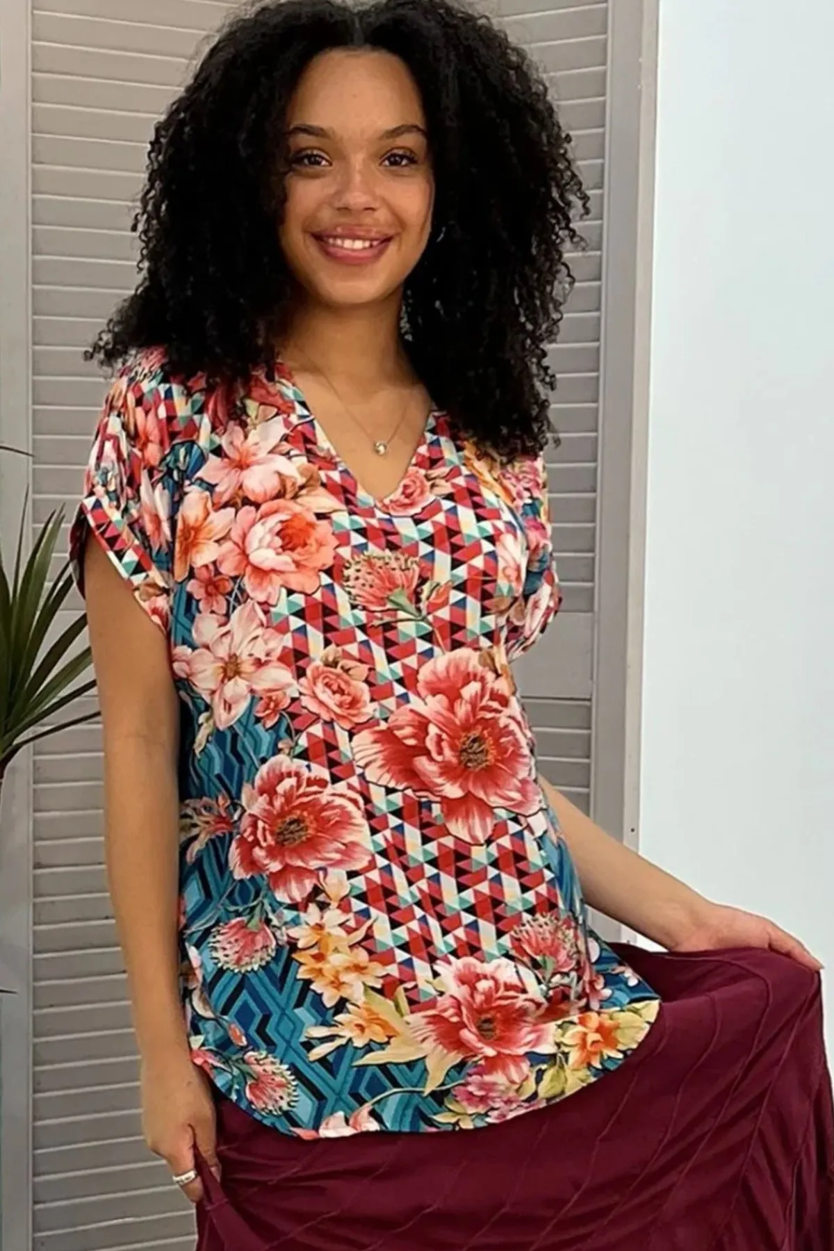 Casual V-neckline silhouette crafted from a luxurious silk viscose blend, featuring an exquisite digital floral diamond print. Perfect for those who appreciate timeless style with contemporary flair.