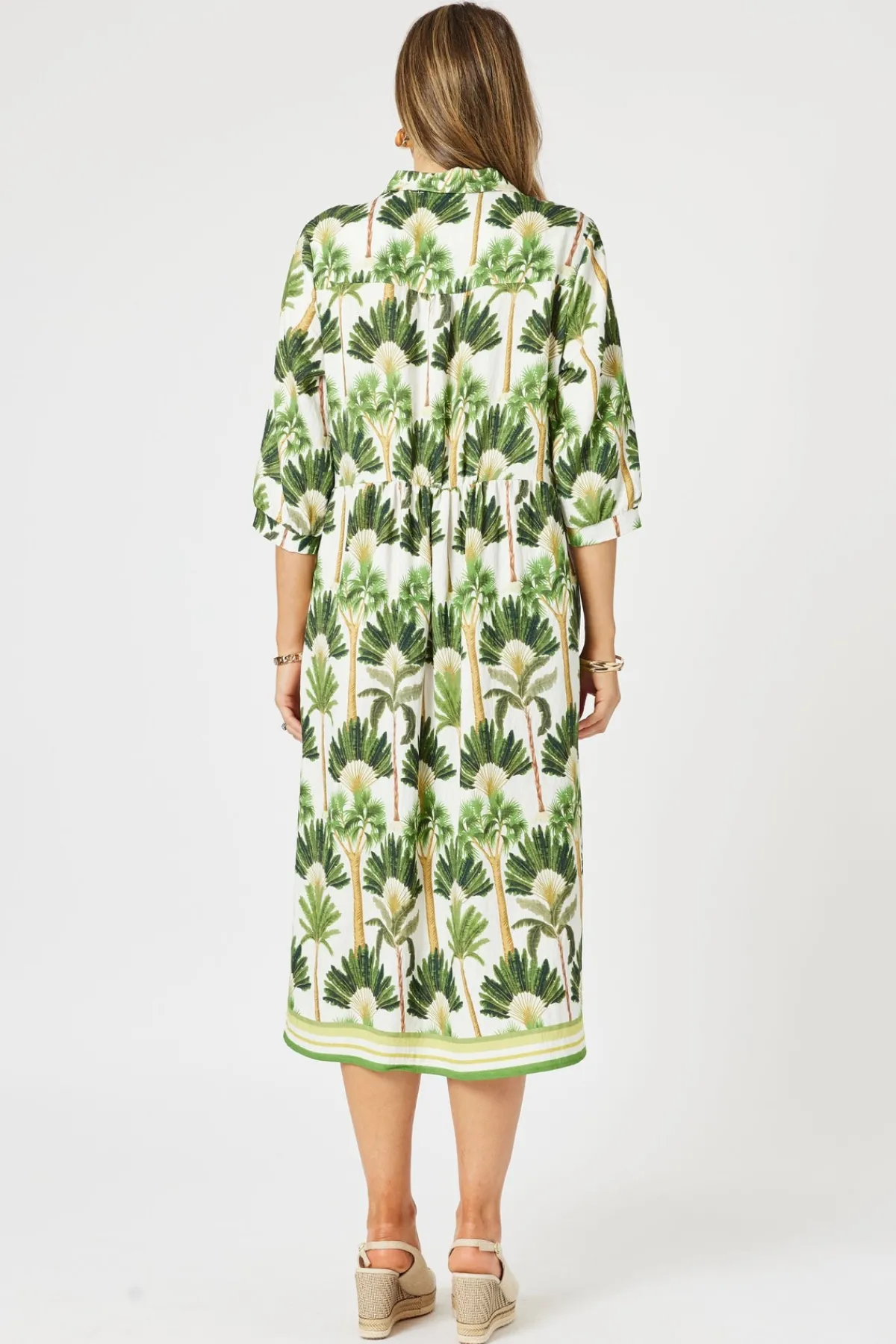 Step into tropical elegance with the Amazon Print Dress.Showcasing a lush green palm motif, this midi dress features a straight, easy-flowing skirt and a comfortable elasticated back waist for a flattering fit.